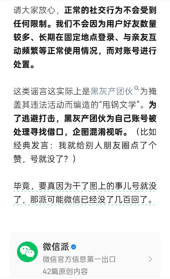 微信官方提到,我们不会因为用户好友数量较多、长期在固定地点登录、与亲友互动频繁等正常使用情况,而对账号进行处置。