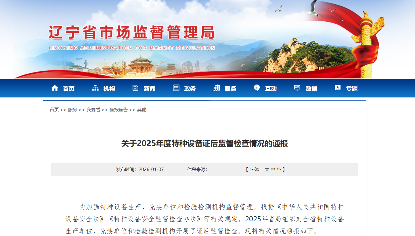 中国质量新闻网讯近日,辽宁省市场监管局网站公布2025年度特种设备证后监督检查情况通报。