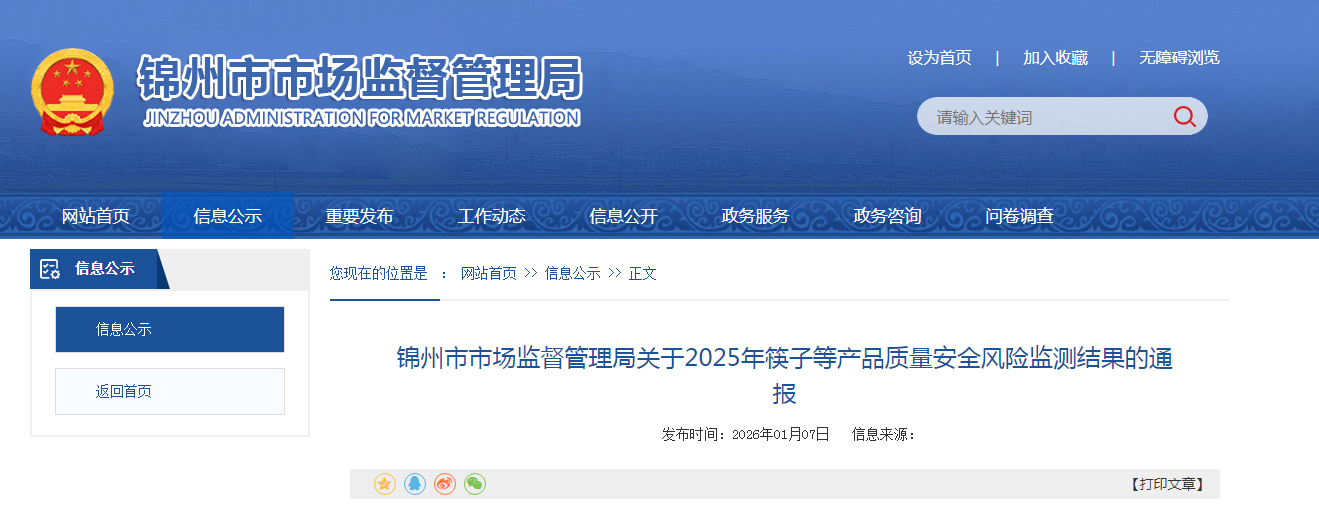中国质量新闻网讯据辽宁省锦州市市场监督管理局网站消息,近期,锦州市市场监督管理局组织开展了筷子、一次性餐饮具产品质量安全风险监测,现将有关情况通报如下: