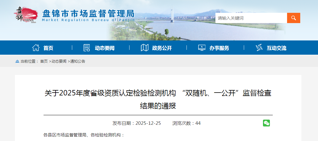中国质量新闻网讯据辽宁省盘锦市市场监督管理局网站消息,近日,盘锦市市场监督管理局通报2025年度省级资质认定检验检测机构“双随机、一公开”监督检查结果。