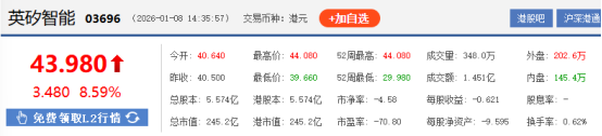 上证报中国证券网讯(记者杨子晏)1月8日,英矽智能午后涨幅持续扩大。截至14时35分,英矽智能报43.98港元/股,涨8.59%,总市值约245亿港元。