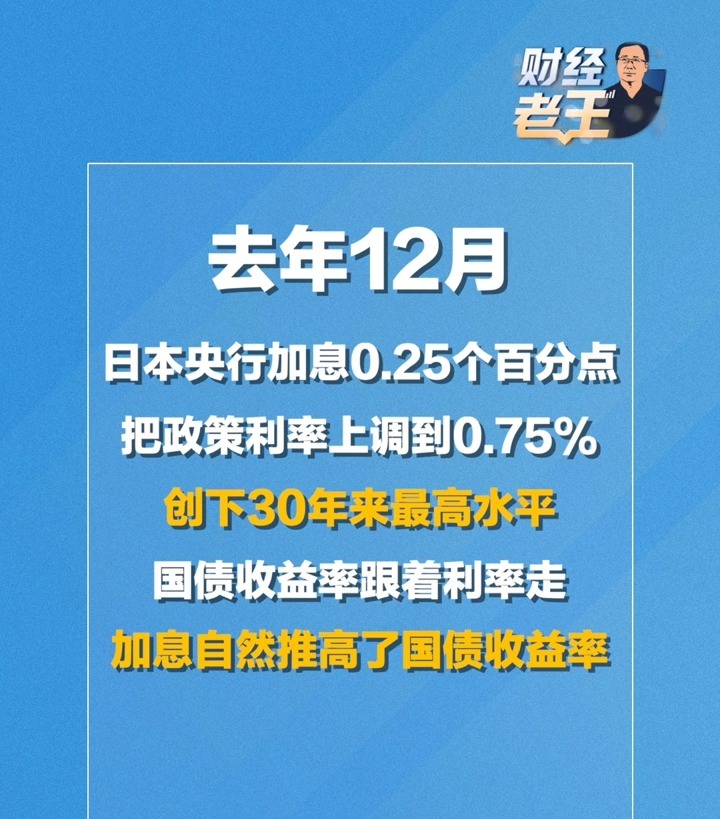 另一个情况,是日本收紧的货币政策。去年12月日本央行加息0.25个百分点,把政策利率上调到0.75%,创下30年来最高水平。国债收益率是跟着利率走的,加息自然也就推高了国债收益率。