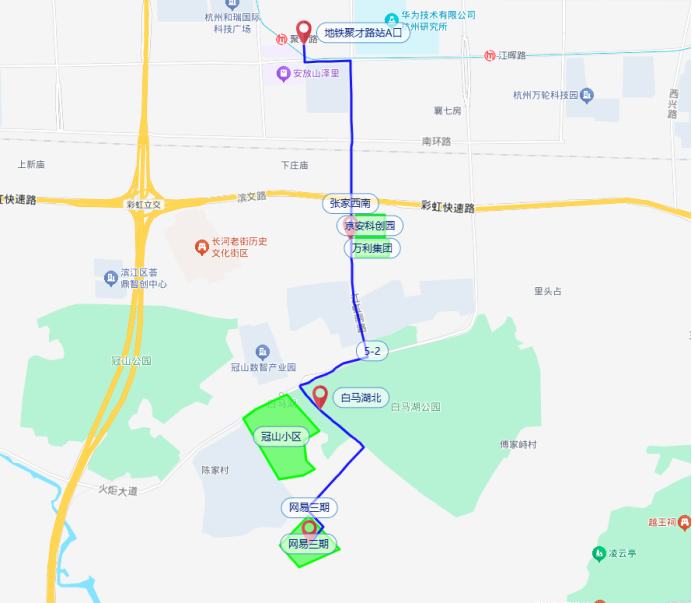 该线路为白马湖创意城内企业员工量身定制,全长4.5公里,途经聚才路、滨康路、江虹路、白马湖路、长江路、天马路、腾龙路,停靠聚才路站A口、张家西南、白马湖北、网易三期东门等4个站点。每天8:25-9:55、18:10-20:25运行,每隔15分钟一班。