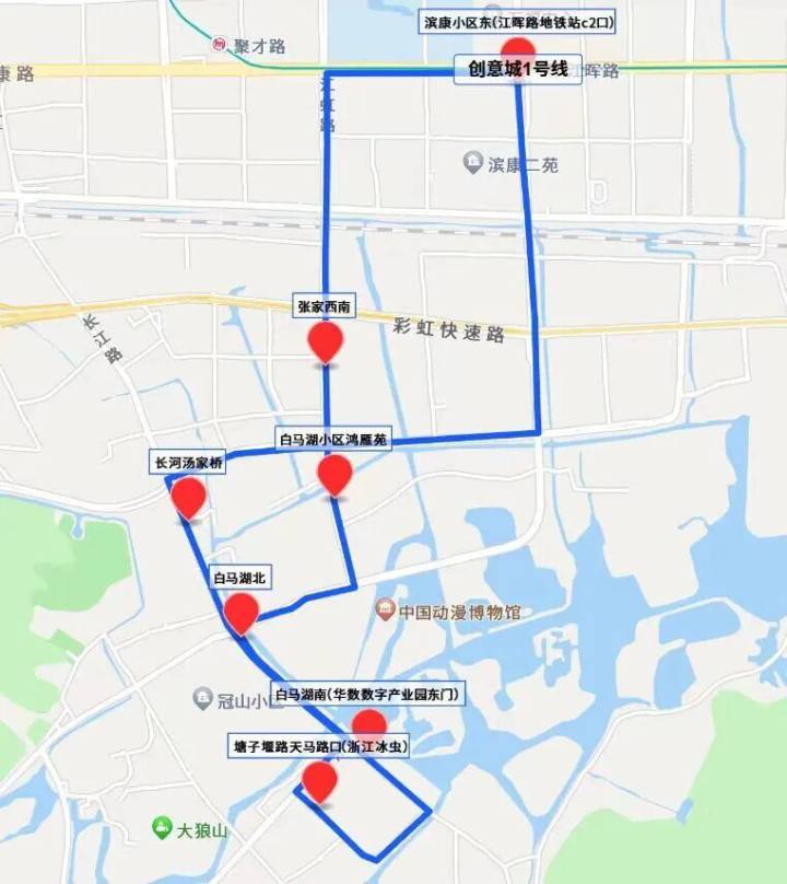 在此之前,白马湖区域已有一条公交接驳线路“创意城1号线”,线路长度9.5公里,环线停靠站点为“滨康小区东(江晖路地铁站c2口)—长河汤家桥—白马湖北—白马湖南(华数产业园东门)—塘子堰路天马路口(浙江冰虫)—白马湖北—白马湖小区鸿雁苑—张家西南—江晖路地铁站”。
