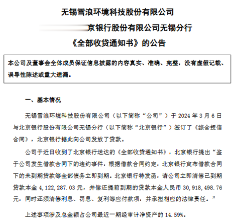 1月8日金融一线消息,无锡雪浪环境科技股份有限公司(简称“雪浪环境”)今日发布公告称,公司于近日收到了北京银行送达的《全部收贷通知书》。