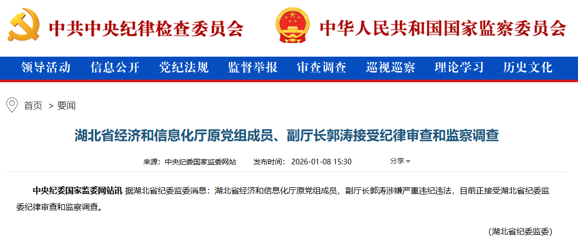 中央纪委国家监委网站1月8日通报,据湖北省纪委监委消息:湖北省经济和信息化厅原党组成员、副厅长郭涛涉嫌严重违纪违法,目前正接受湖北省纪委监委纪律审查和监察调查。(央视网)