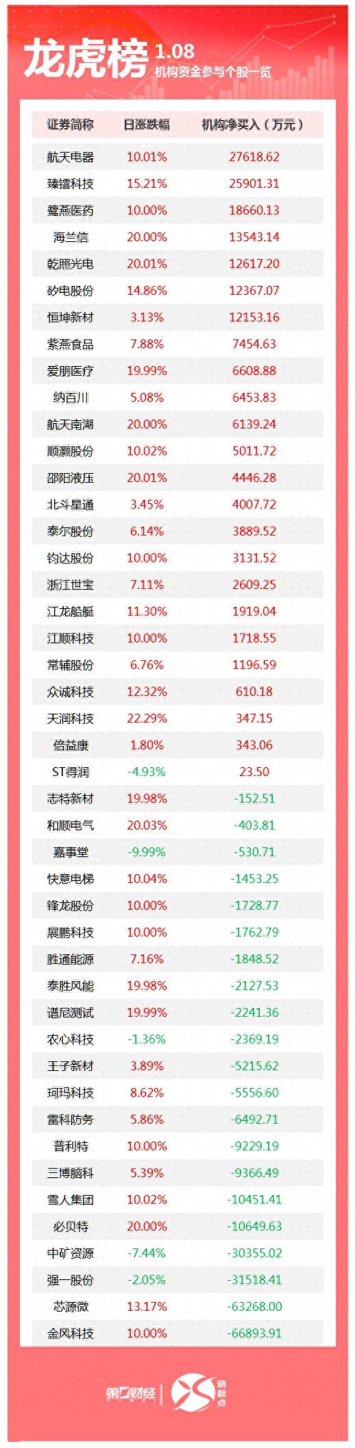 当天机构净买入前三的股票分别是航天电器、臻镭科技、鹭燕医药,净买入金额分别是2.76亿元、2.59亿元、1.87亿元。