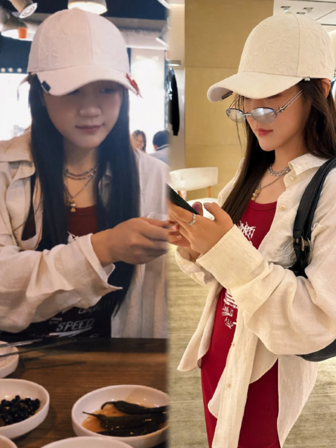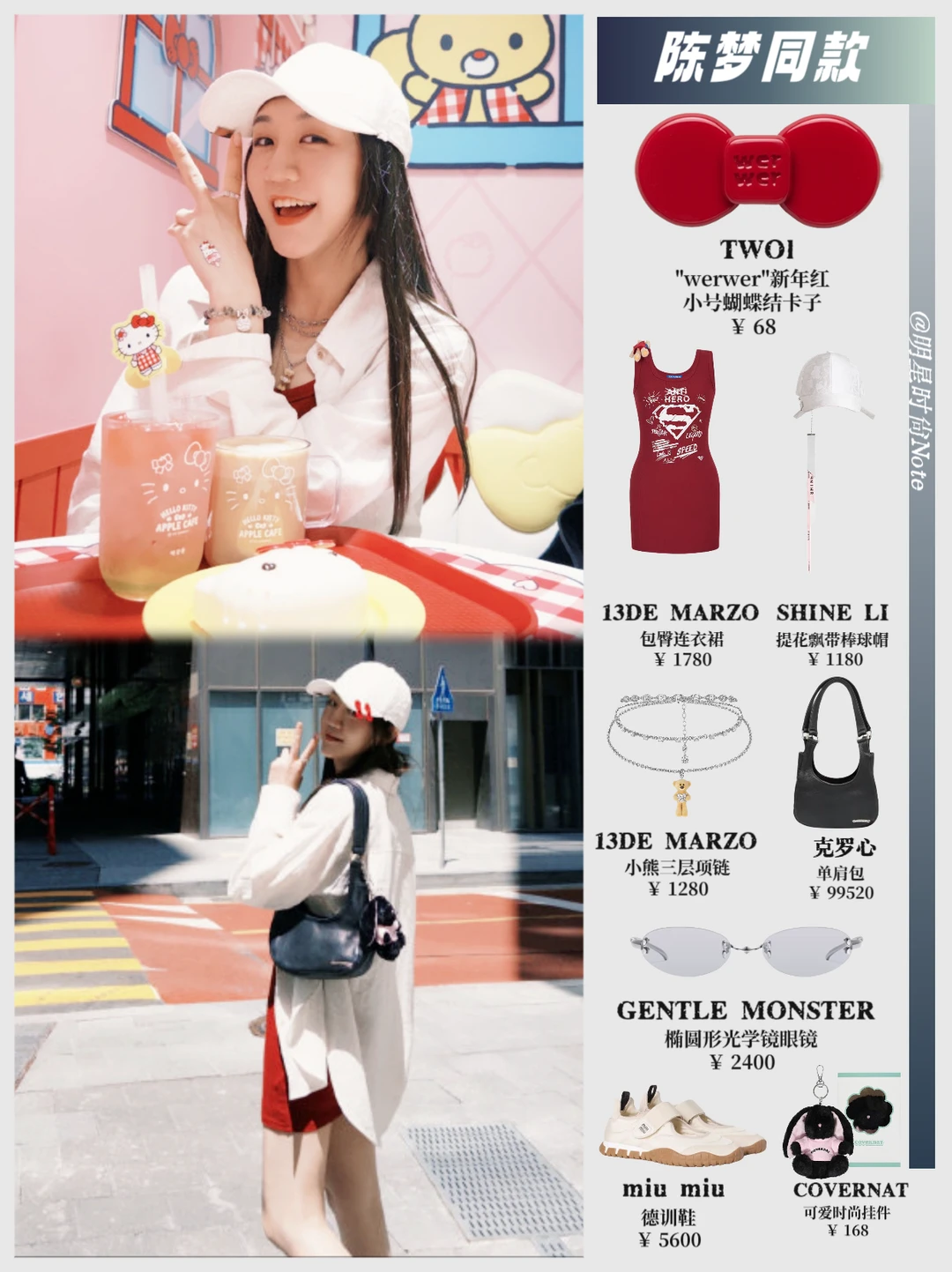 最绝的是棒球帽上别了红色蝴蝶结发卡!和红裙呼应超甜~🎀