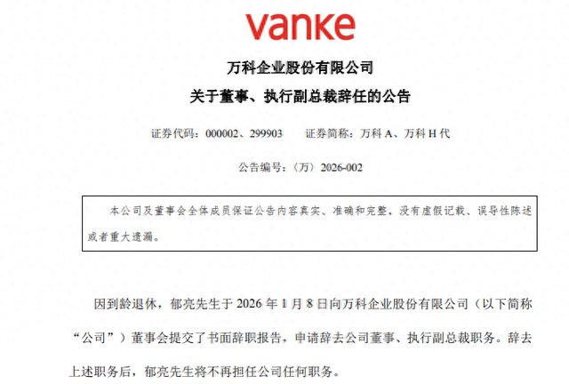 1月8日晚间,万科(000002)公告,因到龄退休,郁亮于2026年1月8日向公司董事会提交了书面辞职报告,申请辞去公司董事、执行副总裁职务。辞去上述职务后,郁亮将不再担任公司任何职务。