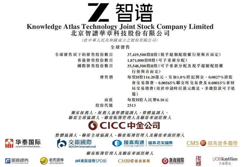 全球公开发售文件显示,智谱计划在本次IPO中发行[3741.95]万股H股。其中,香港公开发售[187.1]万股H股,国际发售[3554.85]万股H股。以每股[116.20]港元发行价计算,智谱本次IPO募资总额预计将达43亿港元,IPO市值预计超511亿港元。