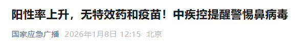 1月7日,中国疾控中心发文提醒,门急诊流感样病例中鼻病毒检测阳性率有所上升,在南方个别省份甚至超过呼吸道合胞病毒、仅次于流感病毒。这表明当前除流感病毒外,鼻病毒是导致呼吸道症状的主要病原体之一。