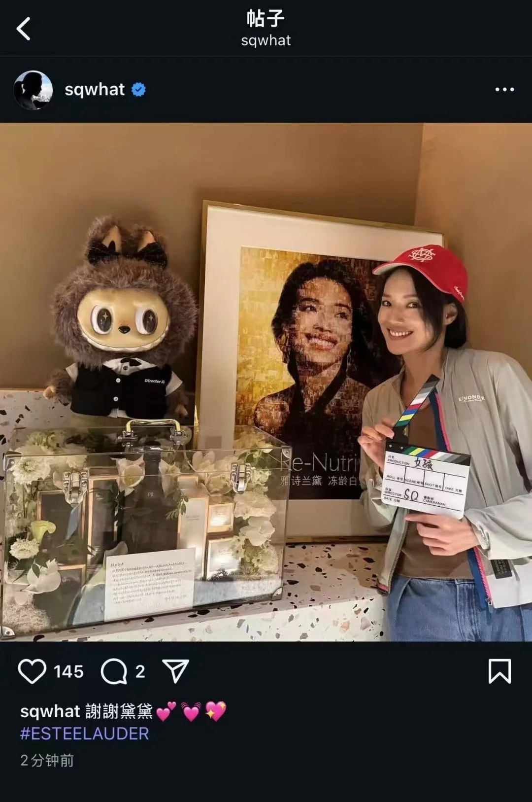 🎬定制导演版Labubu——身穿导演马甲,手执分镜脚本的Labubu,细节诚意拉满!Labubu标志性的“淘气笑容”与舒淇骨子里的灵动不谋而合,手持分镜脚本的细节,正是对她专业素养与创作参与度的无声致敬。这波操作,我只有一个请求:雅诗兰黛,请继续宠她吧!