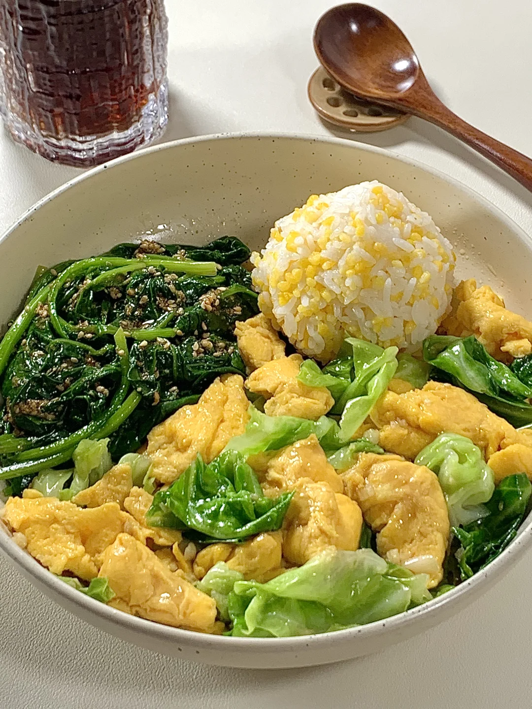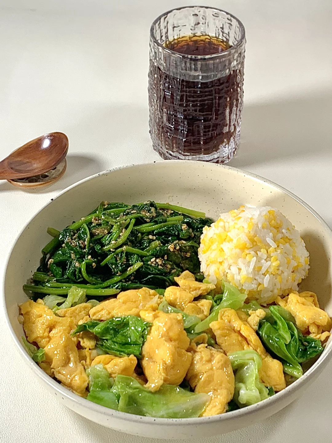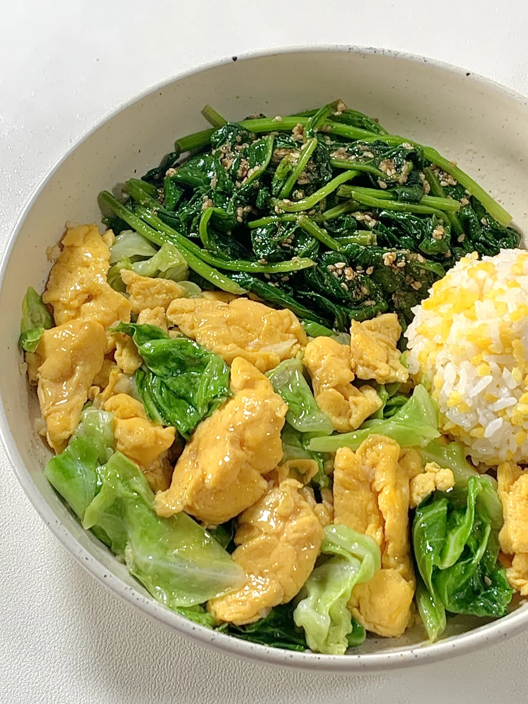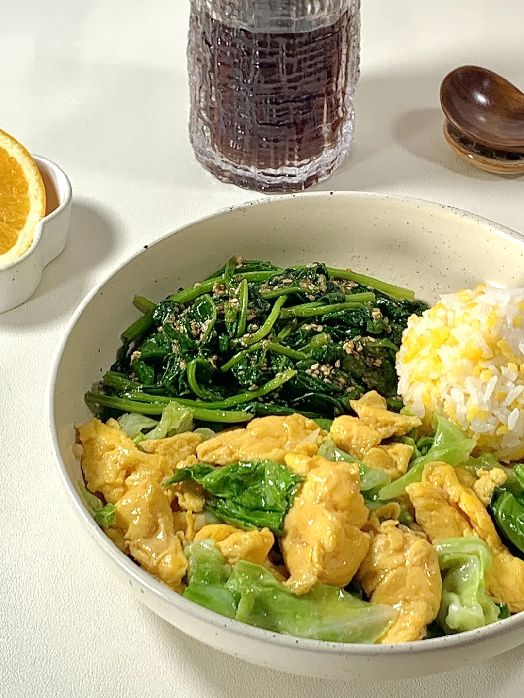 今日减脂餐圆白菜鸡蛋+日式拌菠菜!巨好吃😋 📝食材:鸡蛋、圆白菜、菠菜、适量玉米饭 🫕做法: 1️⃣菠菜焯水~调个酱汁2勺芝麻+2勺生抽+ 1勺芝麻香油+ 2勺凉开水拌匀备用 2️⃣锅里喷油两个鸡蛋炒熟盛出 3️⃣锅里喷油圆白菜炒软+加入鸡蛋+ 1勺生抽+适量鸡精调味即出锅✅ 🍃装盘开吃啦[色色R] ✨玉米饭 📝白米与玉米碎1:2比例~电饭煲焖熟 一人食吃什么 今天晚餐长这样 跟着学做菜 一周减脂餐不重样 低脂低卡 减脂餐 干净饮食笔记灵感 今天晚餐长这样