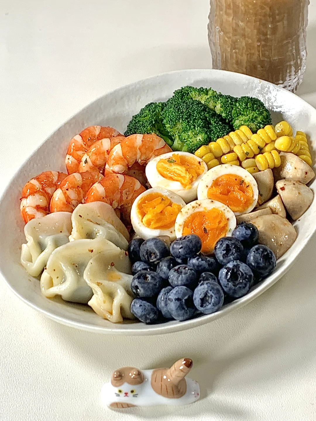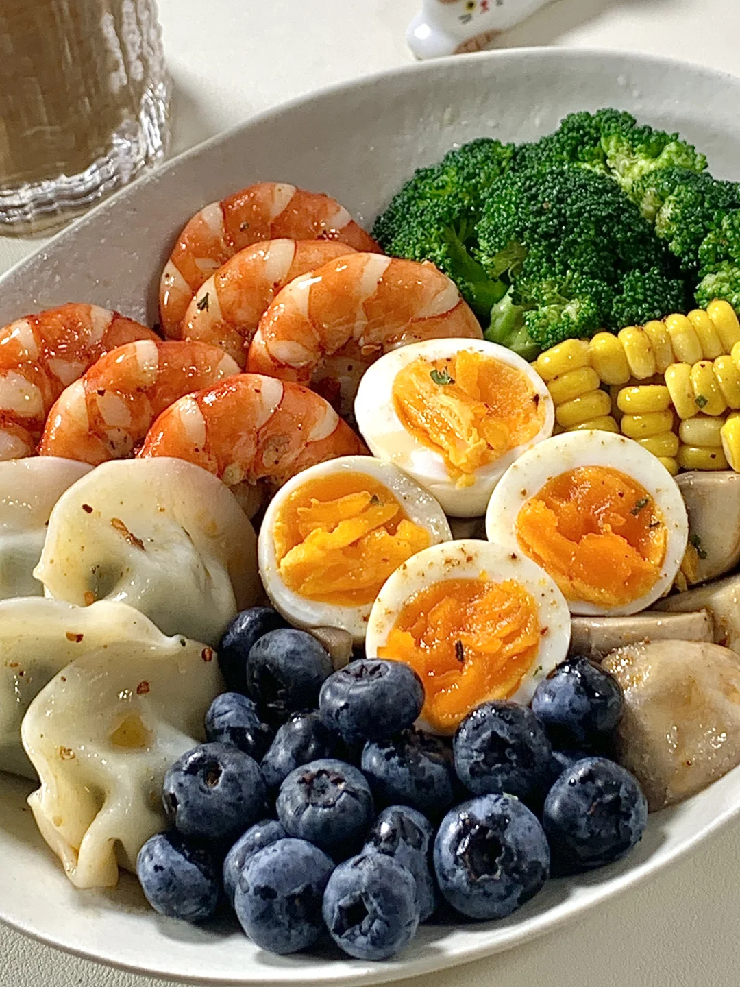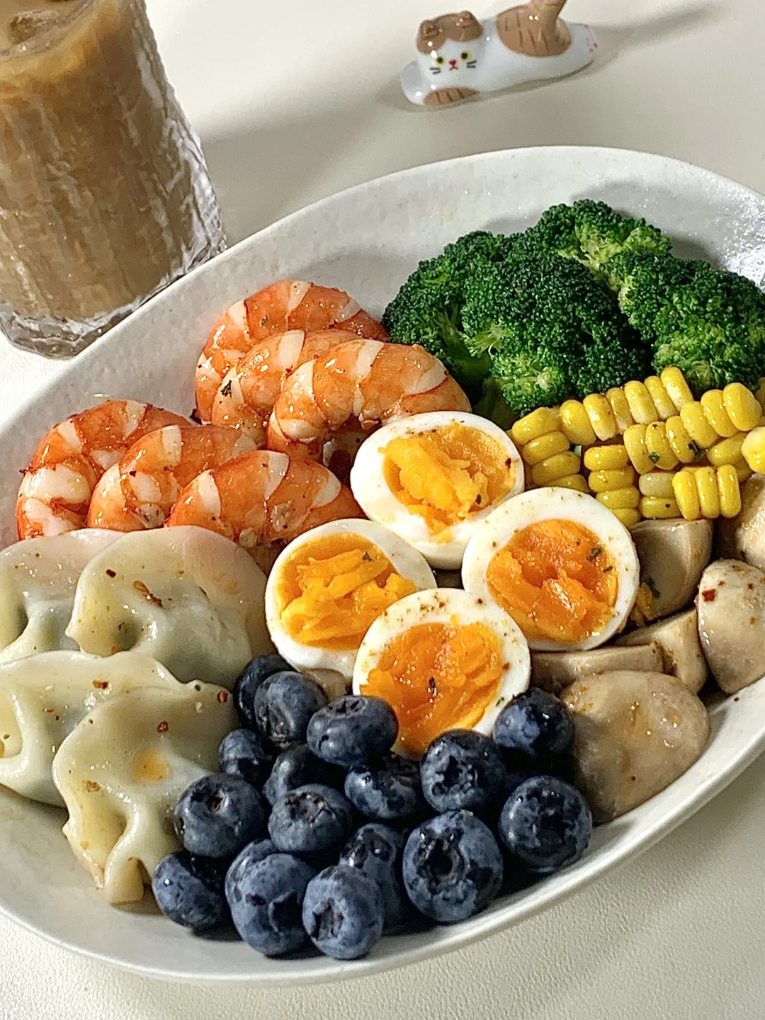 今天吃溏心蛋虾仁拼盘!巨鲜嫩😋 📝食材:虾仁、口蘑、西兰花、玉米、蓝莓、鸡蛋、素饺 🫕做法: 1️⃣锅里水煮开 放入素饺煮熟→西兰花焯水2分钟 2️⃣锅里放水+放鸡蛋煮8分钟捞出过凉水~ 3️⃣起锅喷油虾仁煎熟→口蘑煎熟 漂亮又营养丰富的一盘🍽 搭配一杯拿铁巨解腻[亲一个R]