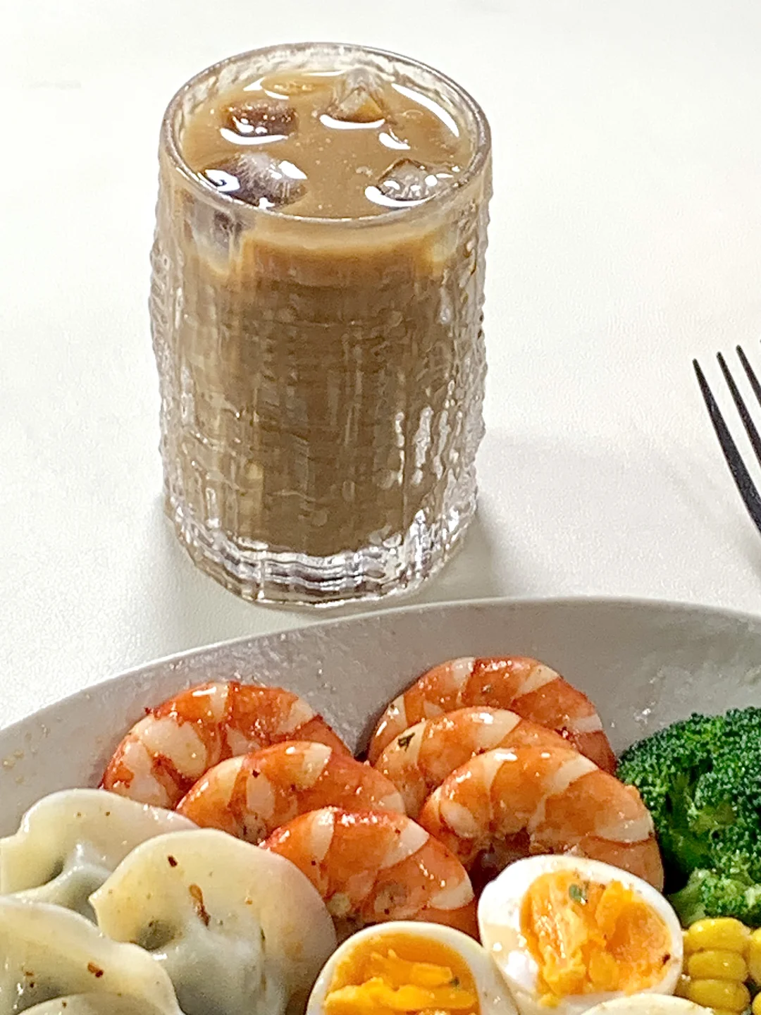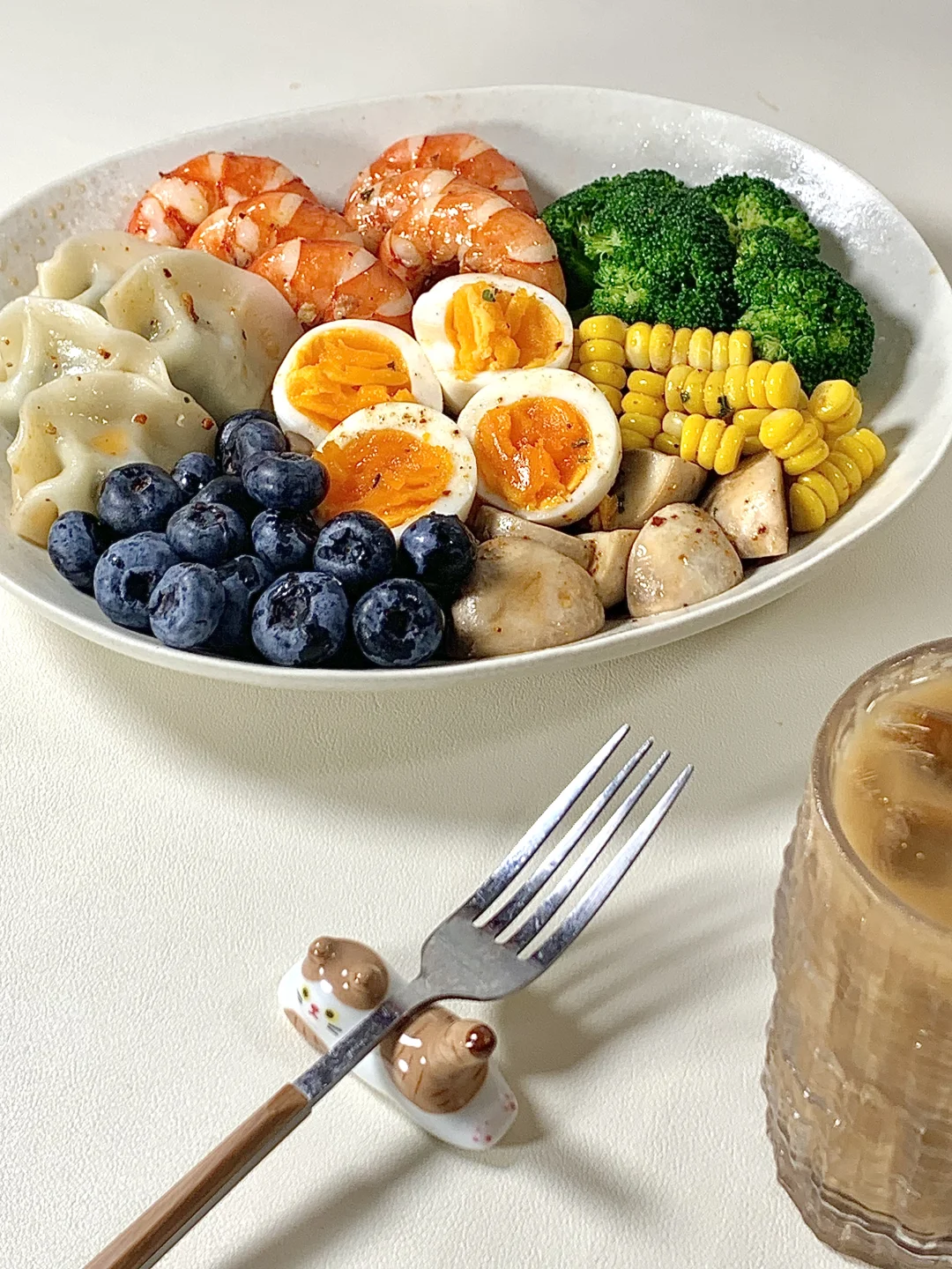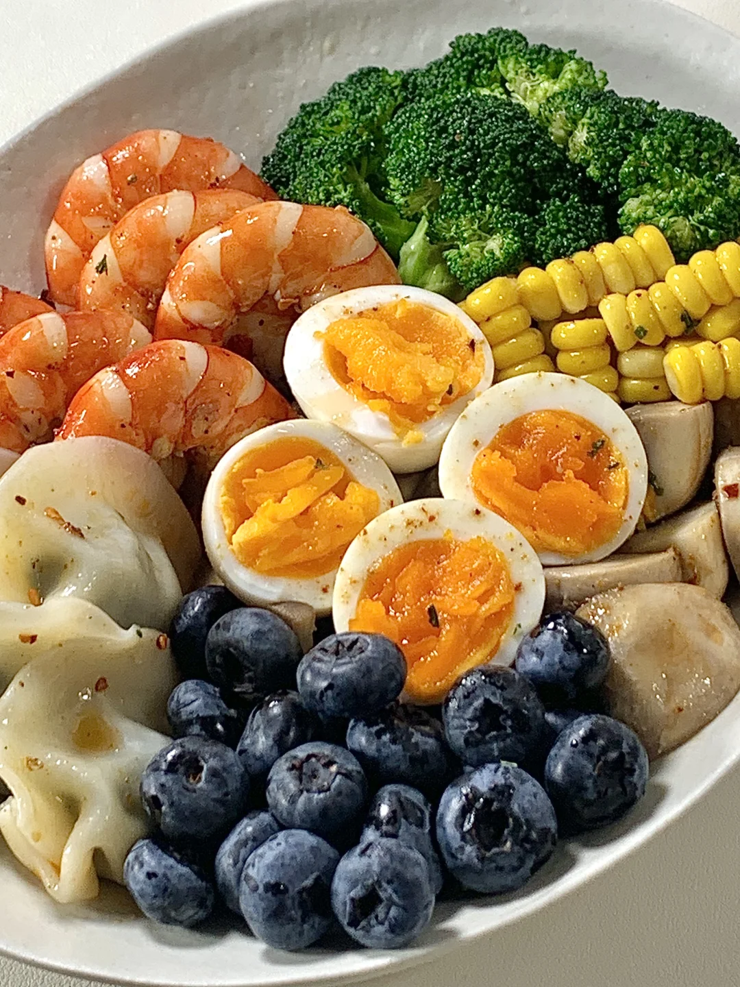 今天吃溏心蛋虾仁拼盘!巨鲜嫩😋 📝食材:虾仁、口蘑、西兰花、玉米、蓝莓、鸡蛋、素饺 🫕做法: 1️⃣锅里水煮开 放入素饺煮熟→西兰花焯水2分钟 2️⃣锅里放水+放鸡蛋煮8分钟捞出过凉水~ 3️⃣起锅喷油虾仁煎熟→口蘑煎熟 漂亮又营养丰富的一盘🍽 搭配一杯拿铁巨解腻[亲一个R]