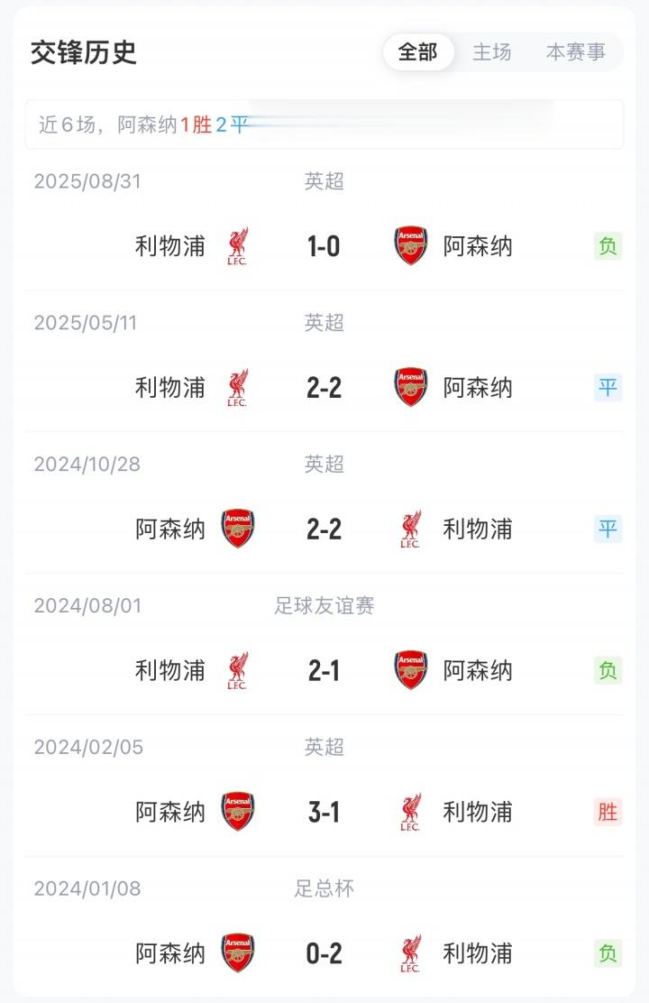 阿森纳联赛15胜3平2负积48分位居英超榜首,各项赛事7连胜;利物浦联赛10胜4平6负积34分,各项赛事已连续9场不败。阿森纳对阵利物浦已连续3场不胜(2平1负),本赛季首回合交锋阿森纳0-1不敌利物浦。