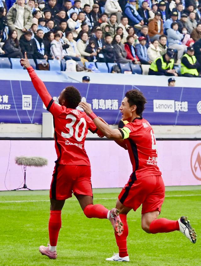 2025年11月22日11月22日,上海海港队球员加布里埃尔(左)在进球后庆祝。当日,在辽宁大连举行的2025赛季中国足球协会超级联赛第30轮比赛中,上海海港队客场1比0战胜大连英博海发队,获得本赛季中超联赛冠军。新华社记者吴青昊摄