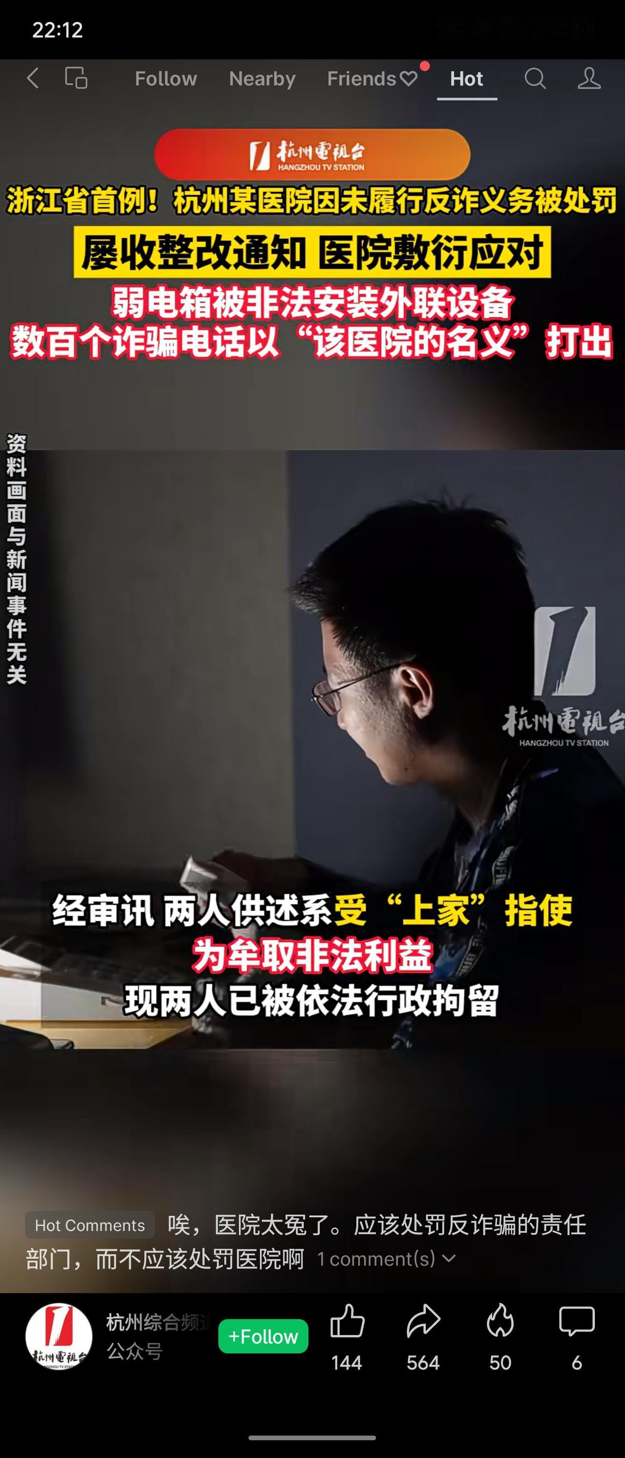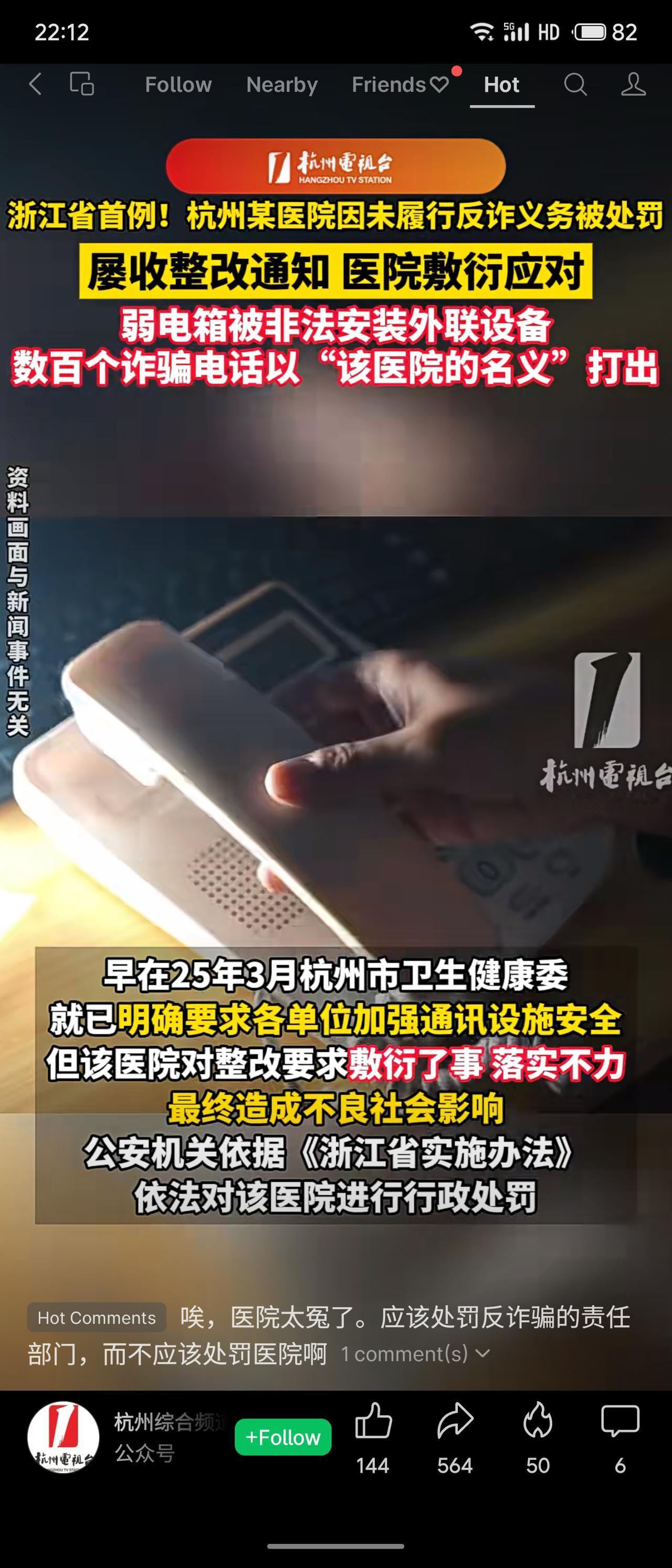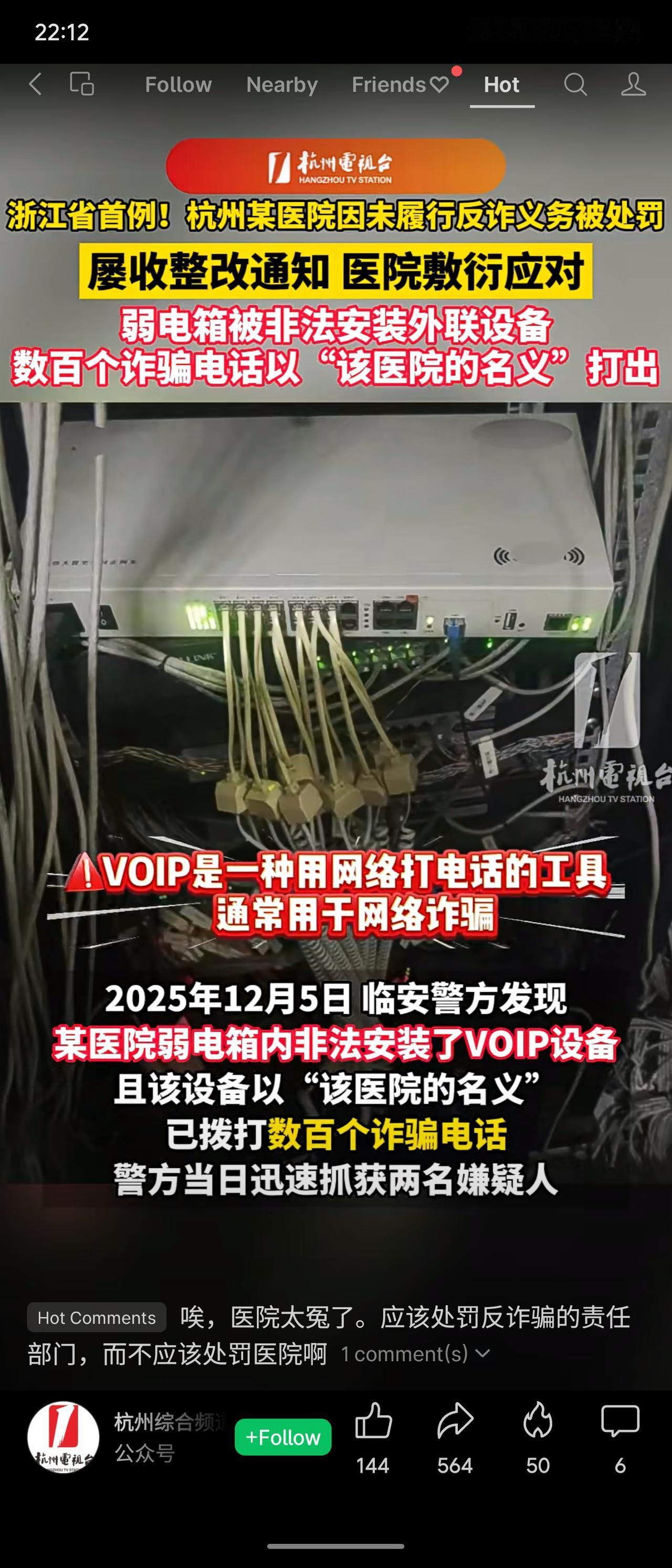 杭州某医院因多次收到通讯设施安全整改通知后敷衍应对,导致弱电箱内被非法安装VOIP设备,冒充该医院名义拨打数百个诈骗电话。警方抓获两名涉案人员,医院因未履行反诈义务被依法行政处罚。有评论质疑处罚对象是否合理。