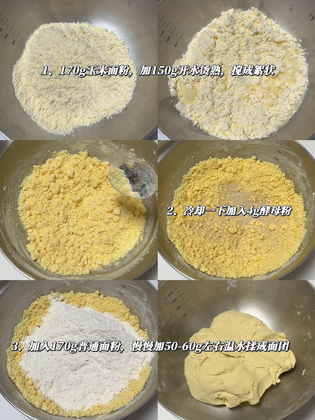 [向右R]食材:玉米面粉170g、中筋面粉170g、开水150g、温水60g左右,酵母粉4g