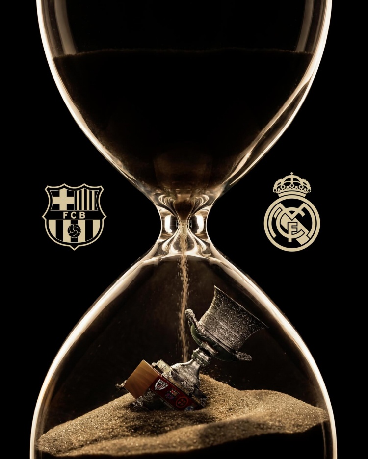 巴萨官方社媒晒出西超杯决赛海报,预热与皇马的国家德比,海报内容为沙漏+西超杯奖杯,两队的队徽分居沙漏两侧。