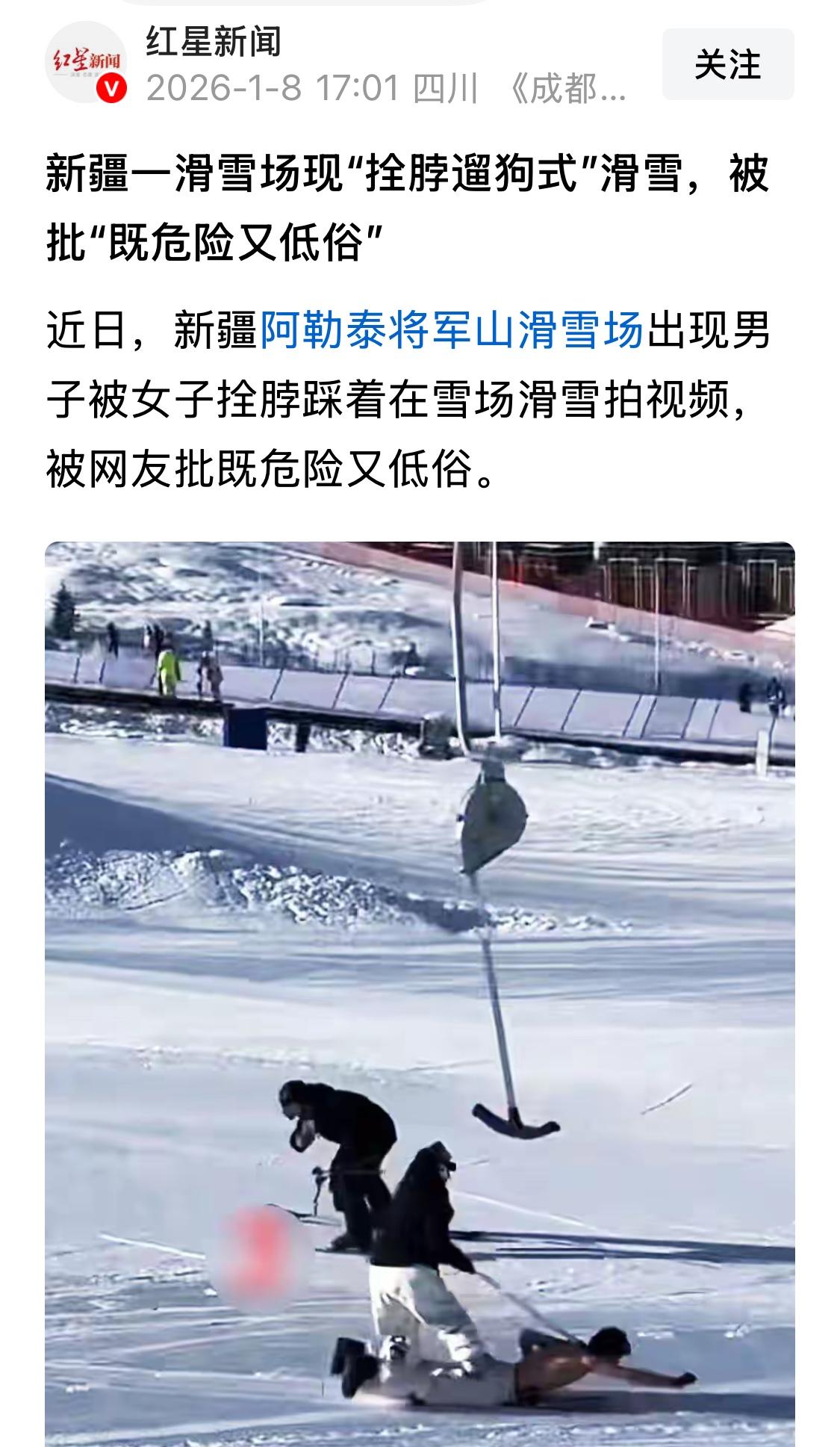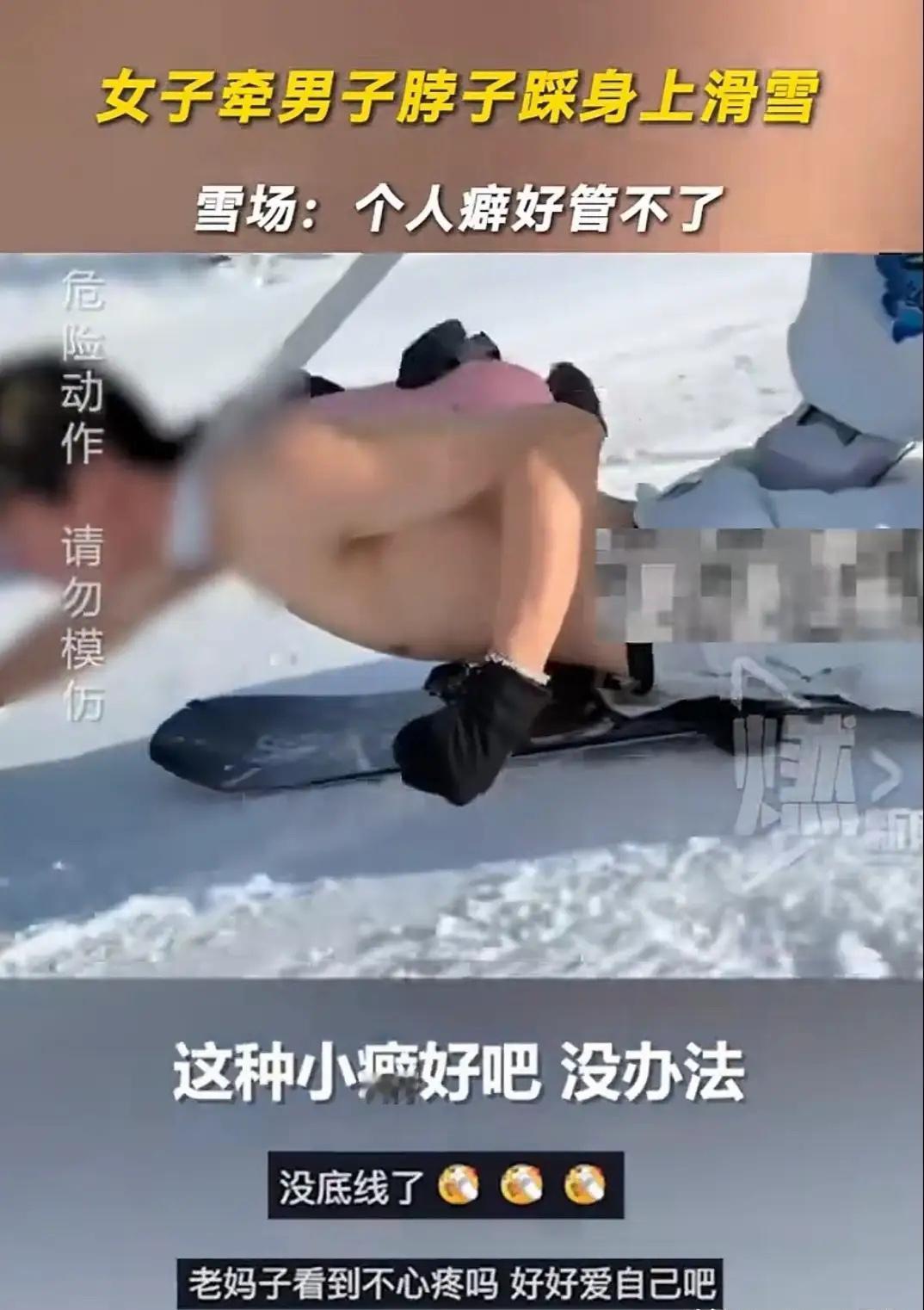 新疆阿勒泰,一名女子手里牵着绳子,绳子绑在男子脖子上,男子上身赤裸压在一块滑雪板上,女子用脚踩在男子的身上往下滑行,往下滑的时候,女子嘴里还喊着飞起来了,飞起来了,随后,女子还很高兴的喊着好玩好玩,真的好玩,两人的旁边还有一人拿手机拍摄着视频。 这段视频在网上传开后,很多人都捏了把汗。滑雪场工作人员看到视频后直摇头,说这种行为真的太危险了。那个被踩着滑行的男子上身没穿衣服,直接贴在冰冷的雪面上,脖子还被绳子套着,万一失控撞上别人或者碰到障碍物,后果不堪设想。 将军山滑雪场可是全国唯一建在市区里的高山滑雪场,平时来滑雪的人特别多。这种危险动作不仅害自己,还可能连累其他雪友。滑雪场马上表了态,说会加强巡逻,再看到这种危险行为一定会劝阻,要是情节严重就直接拉黑处理。 其实滑雪本身就是项高风险运动。据公开报道,数年前将军山滑雪场曾发生过游客闯入未开放雪道不幸身亡的安全事故。当地文旅部门也一直强调要遵守安全规定,某些高难度雪道需要考试合格才能进入。 拍视频求关注可以理解,博眼球的视频或许能获得一时的关注,但只有传递正向价值观的内容,才能真正获得用户的认可。不能为了几个点赞就把安全抛在脑后。滑雪场是大家寻找快乐的地方,不是玩命博眼球的舞台。 真正的滑雪乐趣在于享受冰雪运动的速度与激情,在于和朋友一起感受冬日的美好。而不是搞这些危险又低俗的噱头。 安全永远是第一位的。没有安全,再刺激的玩法都是空谈。 各位读者你们怎么看?欢迎在评论区讨论。