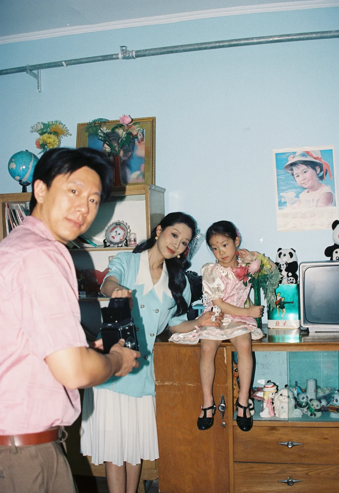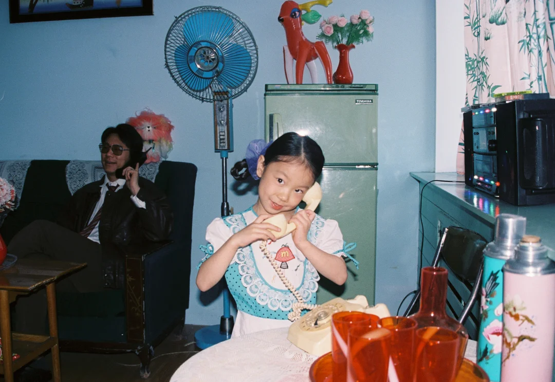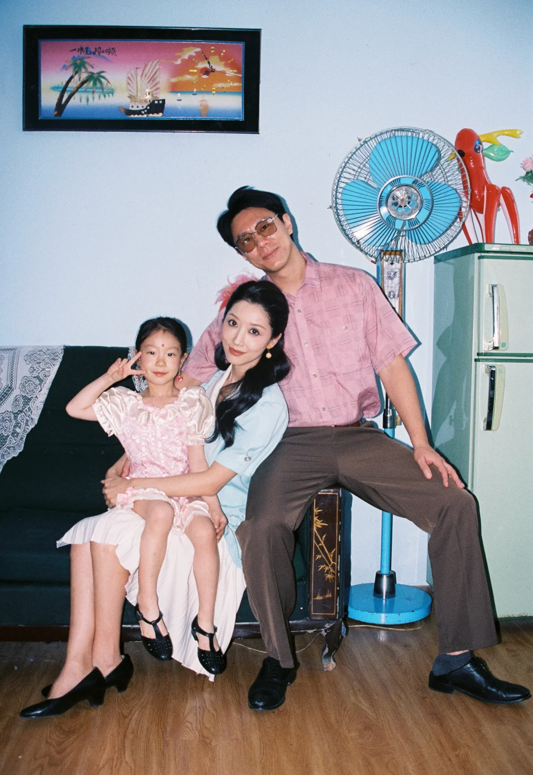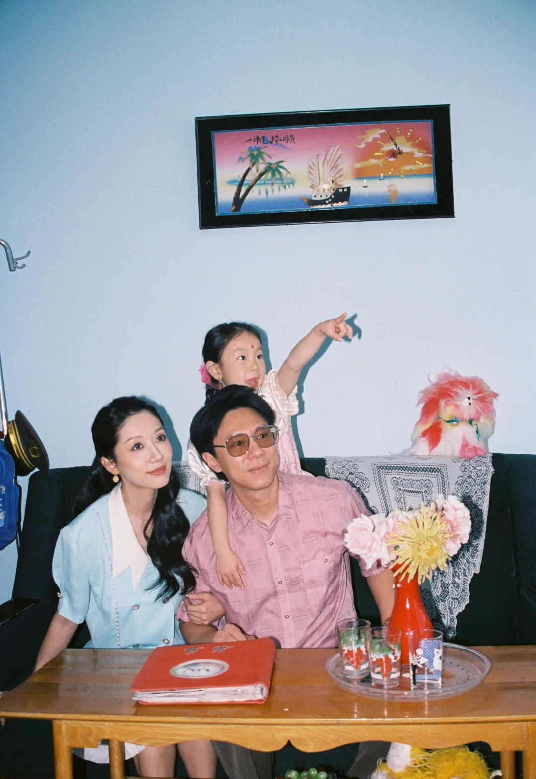 今年的家庭照选了个完全不一样的风格 穿越回到小时候 老折叠桌、绿冰箱、沙发上的蕾丝罩还有粉色毛绒玩具都是那个年代的记忆