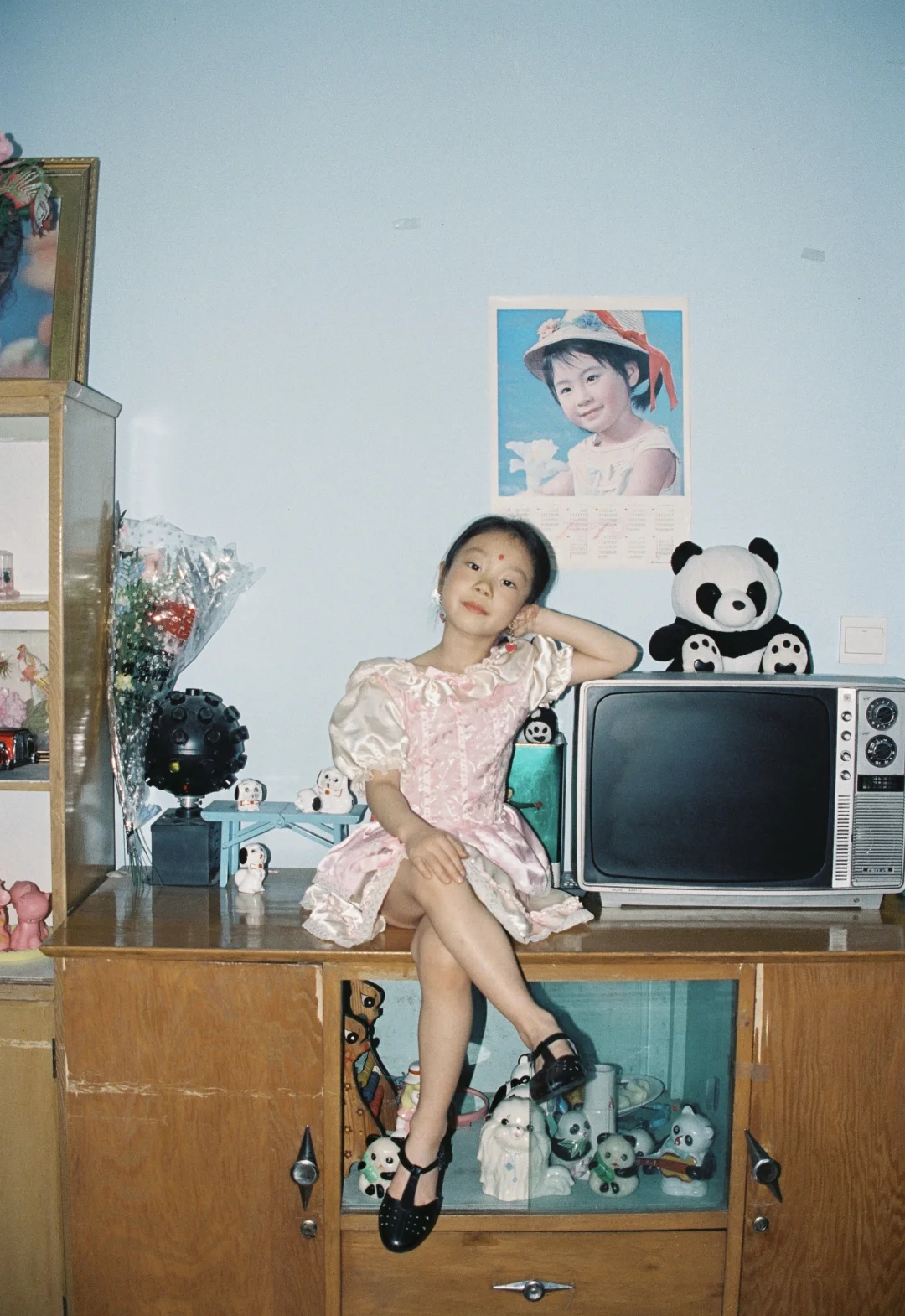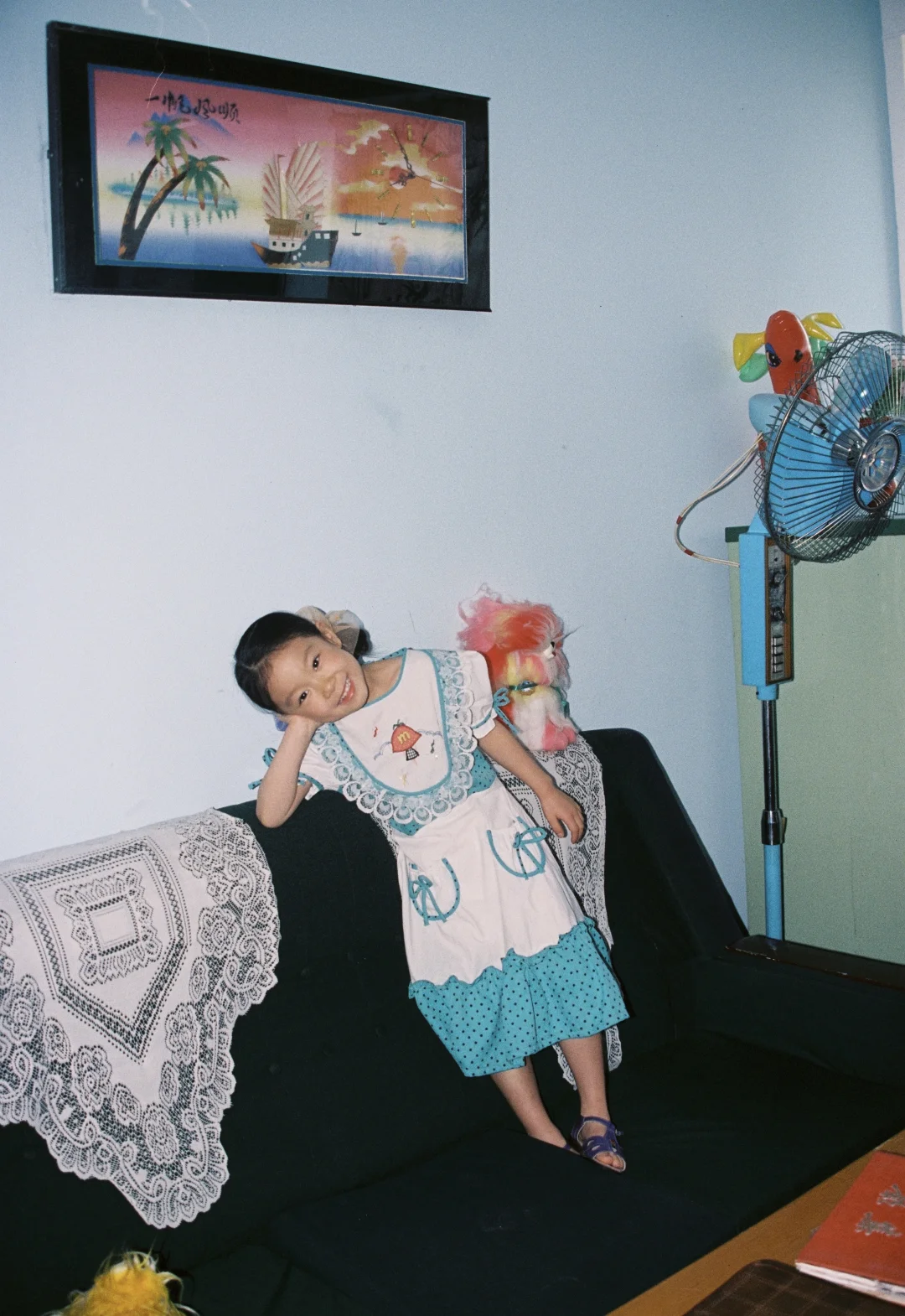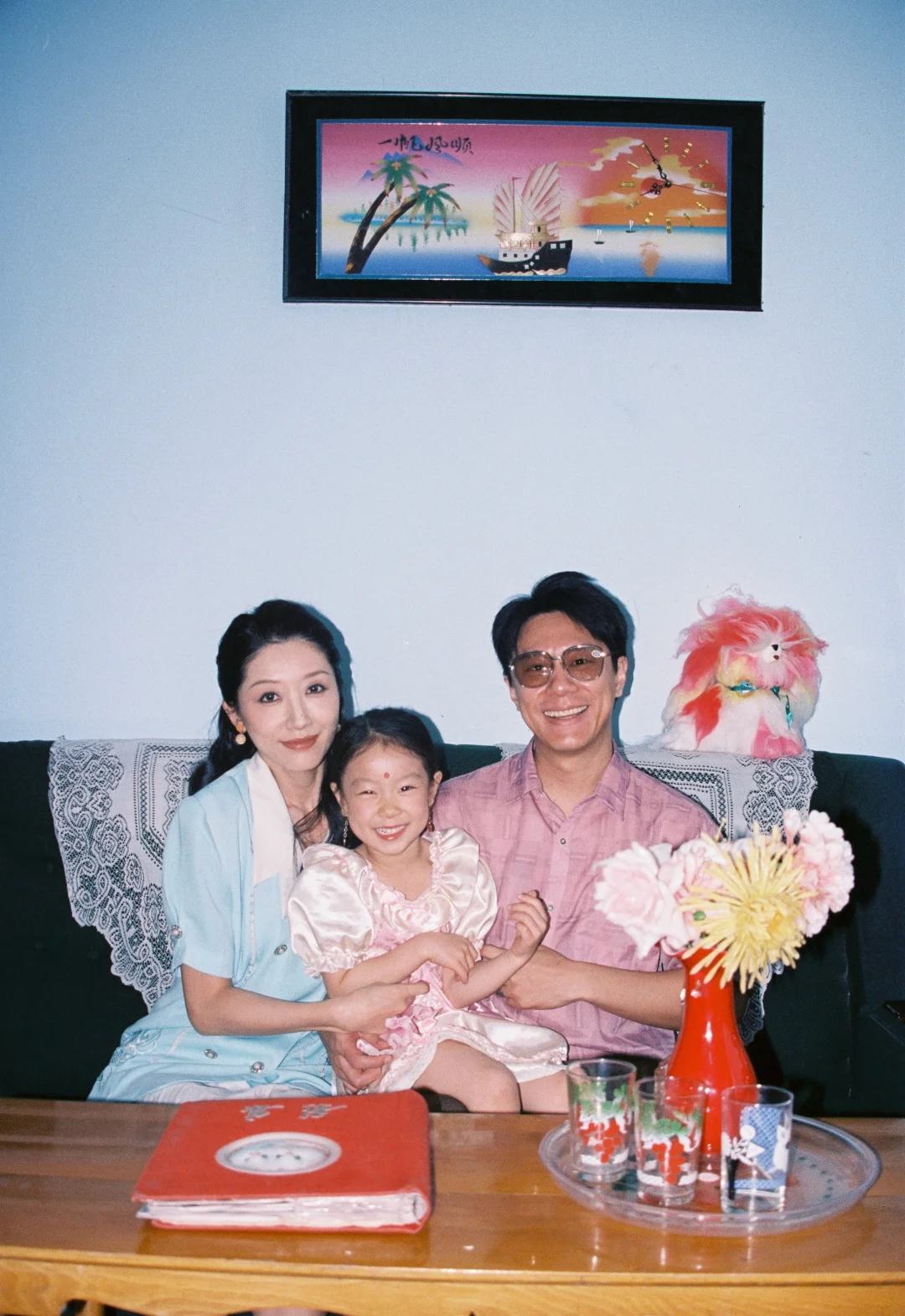 今年的家庭照选了个完全不一样的风格 穿越回到小时候 老折叠桌、绿冰箱、沙发上的蕾丝罩还有粉色毛绒玩具都是那个年代的记忆