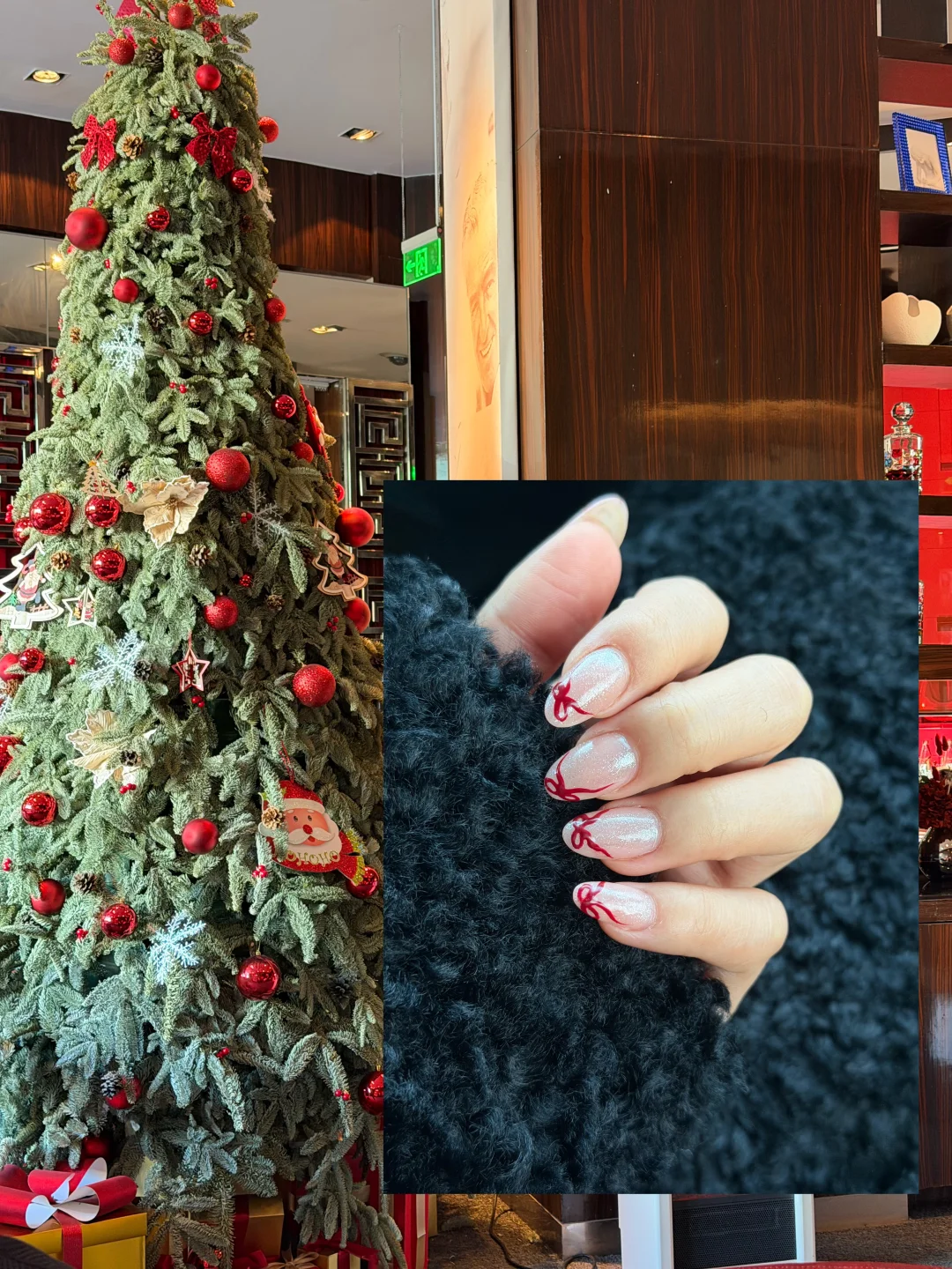 换上新指甲~节日氛围已拉满🎄🎁 珠光打底,特意让美甲师把蝴蝶结画在了指尖,远处看有点儿像红色法式