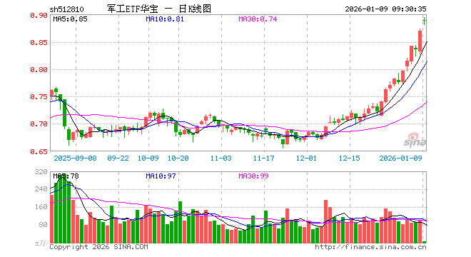 1月9日,军工ETF华宝(512810)开盘涨2.18%,报0.889元。军工ETF华宝(512810)重仓股方面,中国船舶开盘涨0.20%,中航沈飞涨2.73%,光启技术涨0.02%,航发动力涨2.19%,中航光电涨0.83%,中航西飞涨0.67%,中国长城涨0.20%,菲利华跌0.03%,睿创微纳涨0.12%,航天电子涨5.44%。