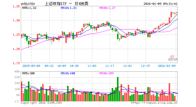 1月9日,上证综指ETF(510760)开盘涨0.08%,报1.325元。上证综指ETF(510760)重仓股方面,农业银行开盘跌0.27%,工商银行涨0.00%,贵州茅台涨0.33%,中国石油涨1.84%,招商银行跌0.10%,工业富联跌1.35%,中国人寿跌0.02%,寒武纪跌1.66%,中国银行跌0.18%,中国平安涨0.31%。