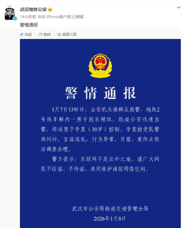 1月8日,武汉地铁公安通报“2号线车厢内一男子脱衣裸体”:李某言语混乱、行为异常,案件正依法办理。