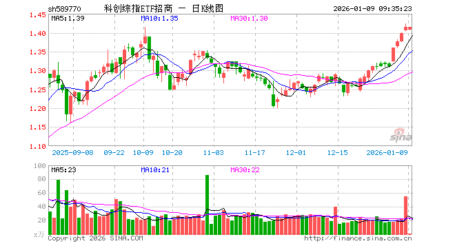 1月9日,科创综指ETF招商(589770)开盘跌0.49%,报1.408元。科创综指ETF招商(589770)重仓股方面,海光信息开盘跌1.52%,寒武纪跌1.66%,中芯国际跌0.77%,中微公司跌3.89%,澜起科技跌0.82%,百利天恒跌0.11%,金山办公跌0.16%,联影医疗涨0.79%,影石创新跌0.06%,传音控股跌0.33%。