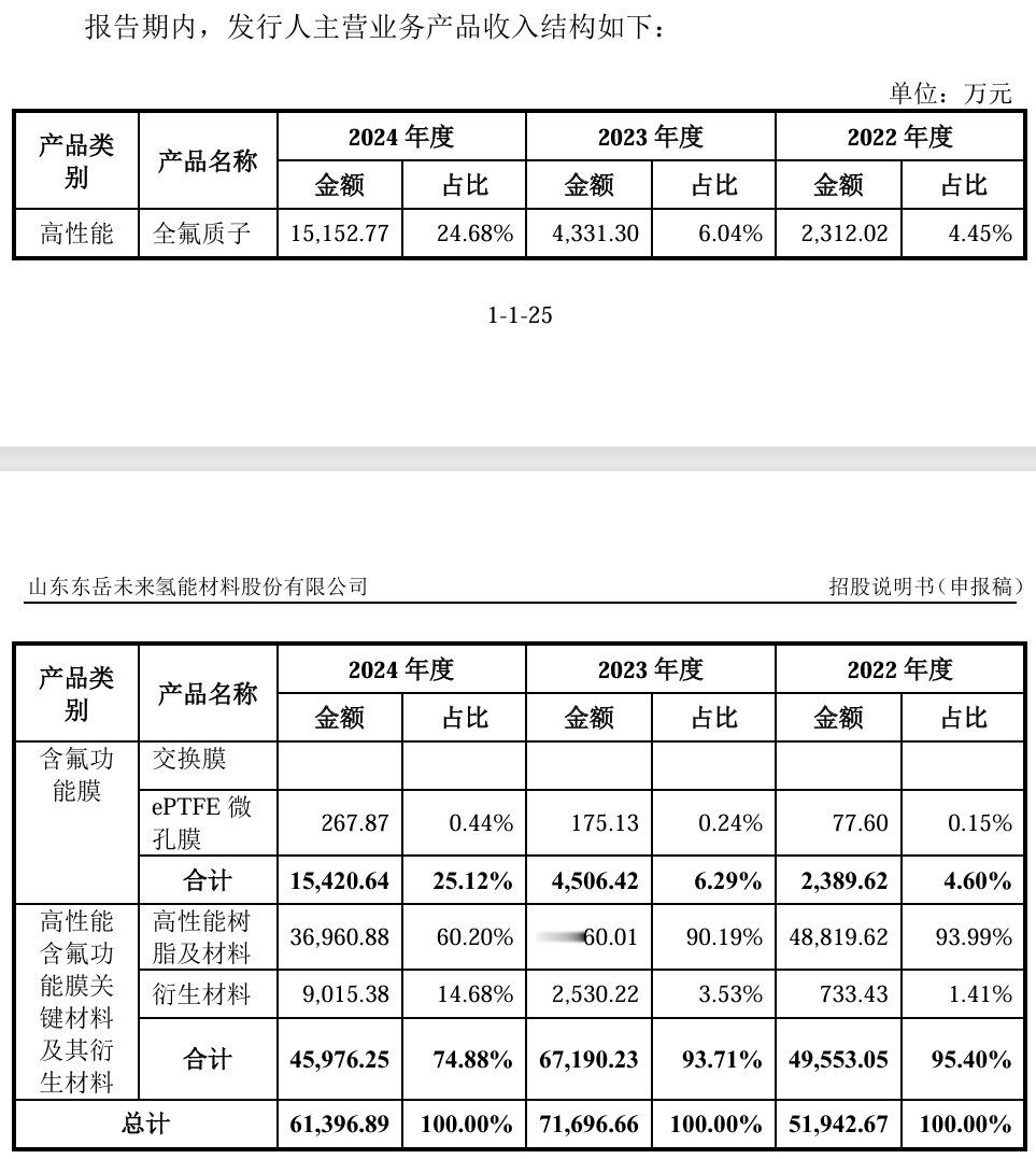 在资本市场与产业舆论中,未来材料常被贴上“氢能第一膜”等标签,产品覆盖氢能相关材料。但其当前收入主要来源仍集中于含氟功能膜及其衍生品,质子交换膜等核心氢能材料占比相对有限(2024年已迅速上升至接近四分之一),其商业化节奏与业绩兑现,仍需更长周期检验。