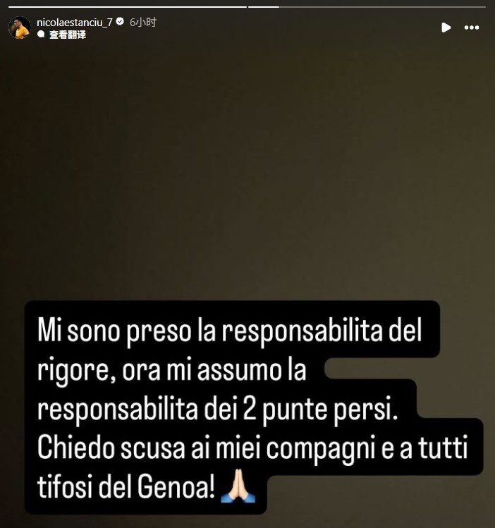 直播吧1月9日讯今天凌晨,热那亚在意甲1-1战平AC米兰,热那亚球员斯坦丘罚丢点球,赛后他在社交媒体发文道歉。