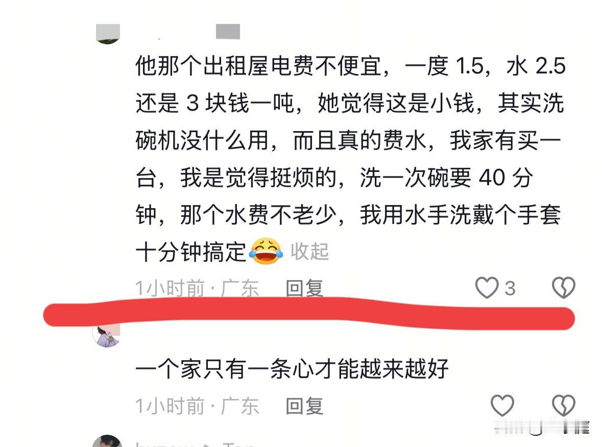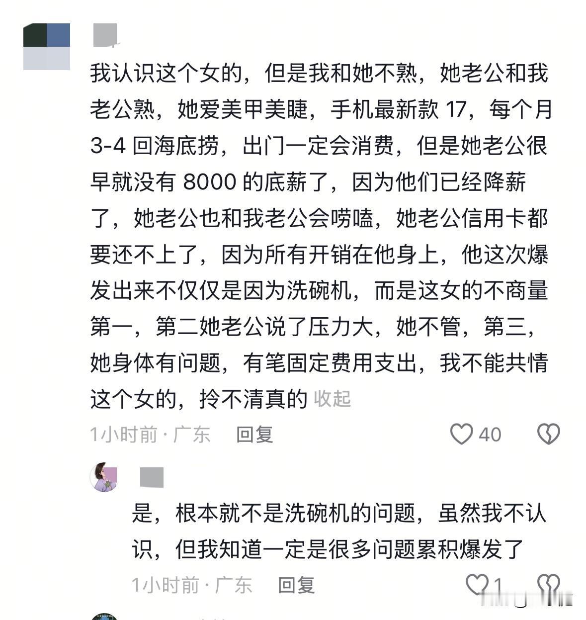 为了一个1519元的洗碗机为什么要把家砸了?原来,当事人丈夫早就被降薪了,连信用卡都没还上。 在知情人发声后,一切都貌似找到了答案。 当事人女子并不了解自己丈夫的真实处境。她认为自己丈夫每个月有8000元的底薪,加上提成后轻轻松松就上万了。在她的认知里,她以为这笔1519元的洗碗机根本不算什么。 实际上,丈夫背负了很大的压力,只是没有将实情告诉她。 根据一位知情网友的发声所知:女子丈夫很早就没有8000的底薪了,其次,女子个人的消费水平较高,加上她目前身体不太好,没有工作,每个月都需要一笔固定的支出。 她丈夫的收入,不仅要负担他们全家在广州的开销和租金,还要负责两个孩子的学费,人情往来,也确实不容易。 在此之前,他的信用卡都还没还上。所以,洗碗机一事,只是爆发点而已。 表面上看来,一千多元的洗碗机确实不贵!但对于一个背负了巨大压力、还有债务在身的人来说,确实也是没必要的一笔支出。 再加上,他们的房子是租的,厨房里根本没有合适的地方放洗碗机。 男子之所以情绪失控,把家砸了,在于两个人理念完全不同,没有做到相互理解和尊重! 站在女子的角度来看,她带孩子很辛苦,加上身体不好,洗碗的时候怕凉,想买一个洗碗机也无可厚非。 可站在丈夫的立场考虑,他一个人挣钱养全家。压力已经那么大了,还欠了外债。想在生活中节约一点,也是人之常情。 双方其实都没有错,只是他们目前的处境确实不太好。 男子真正介意的不是洗碗机那1519元钱,而是长久以来积累的压力,在他感觉无能为力的时候,妻子压根就不懂得共情他的难处。这才是他情绪彻底失控的关键! 其实,夫妻之间,最重要的是齐心协力把日子过好,有多大的能力办多大的事。 希望他们两个人冷静下来后,能好好的坐下来沟通,懂得相互体谅,相互包容! 一个家庭过日子,凡事有商有量,根据自己的能力去理性消费,多去为对方想想,矛盾就会少很多。这点,大家认同吗?欢迎留言交流!