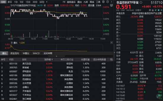 吃喝板块午后有所回落,截至发稿,反映吃喝板块整体走势的食品饮料ETF华宝(515710)场内价格涨0.17%。