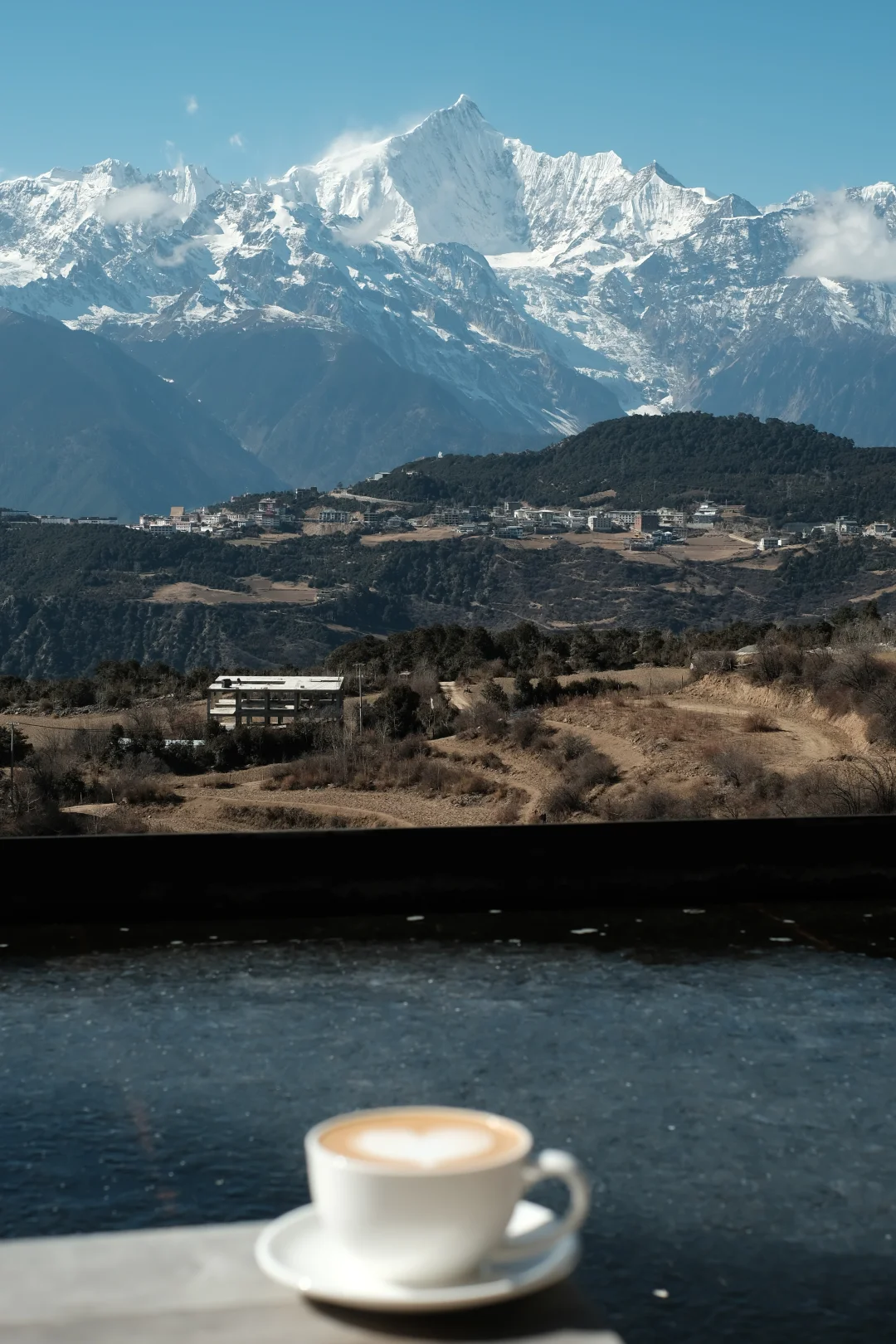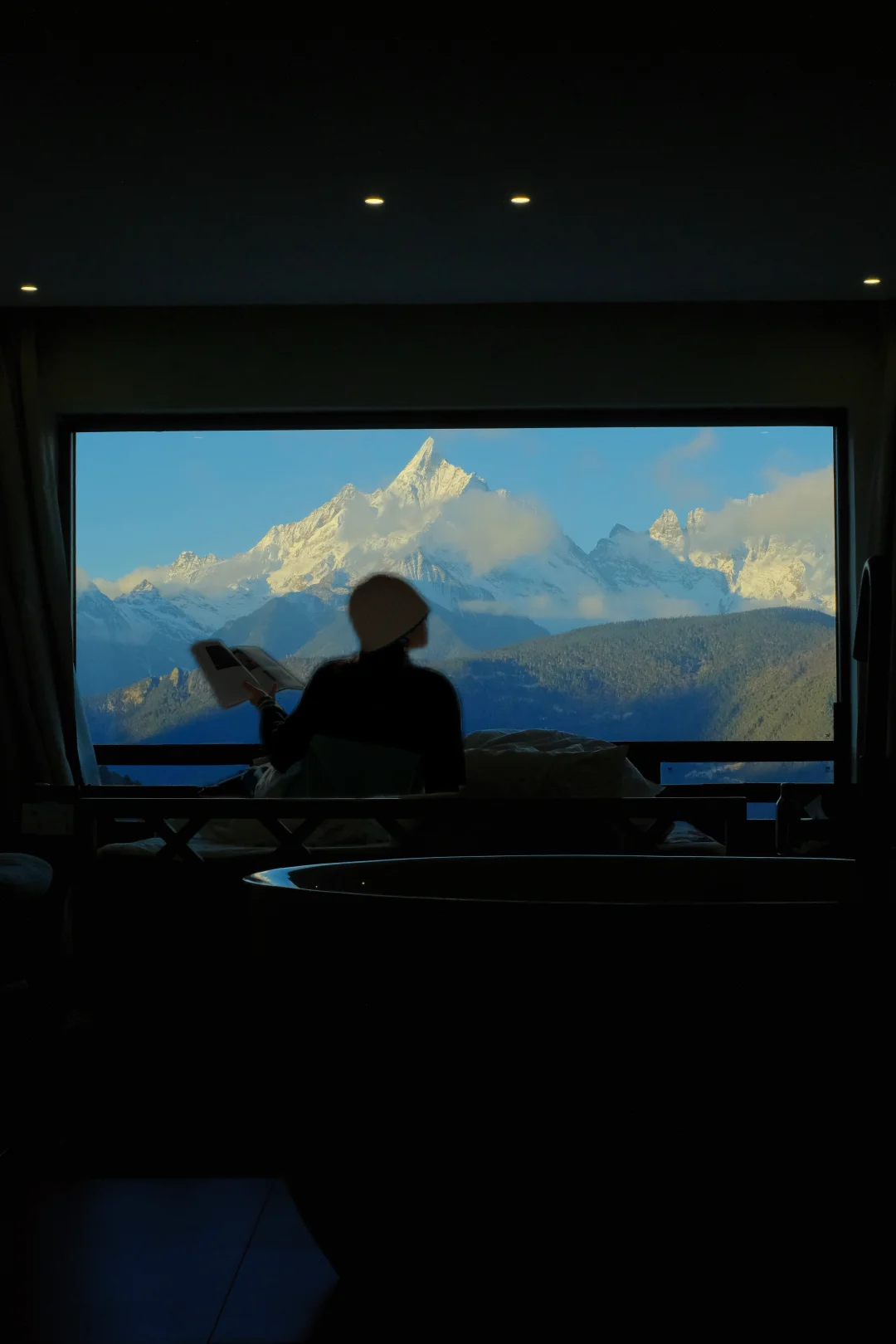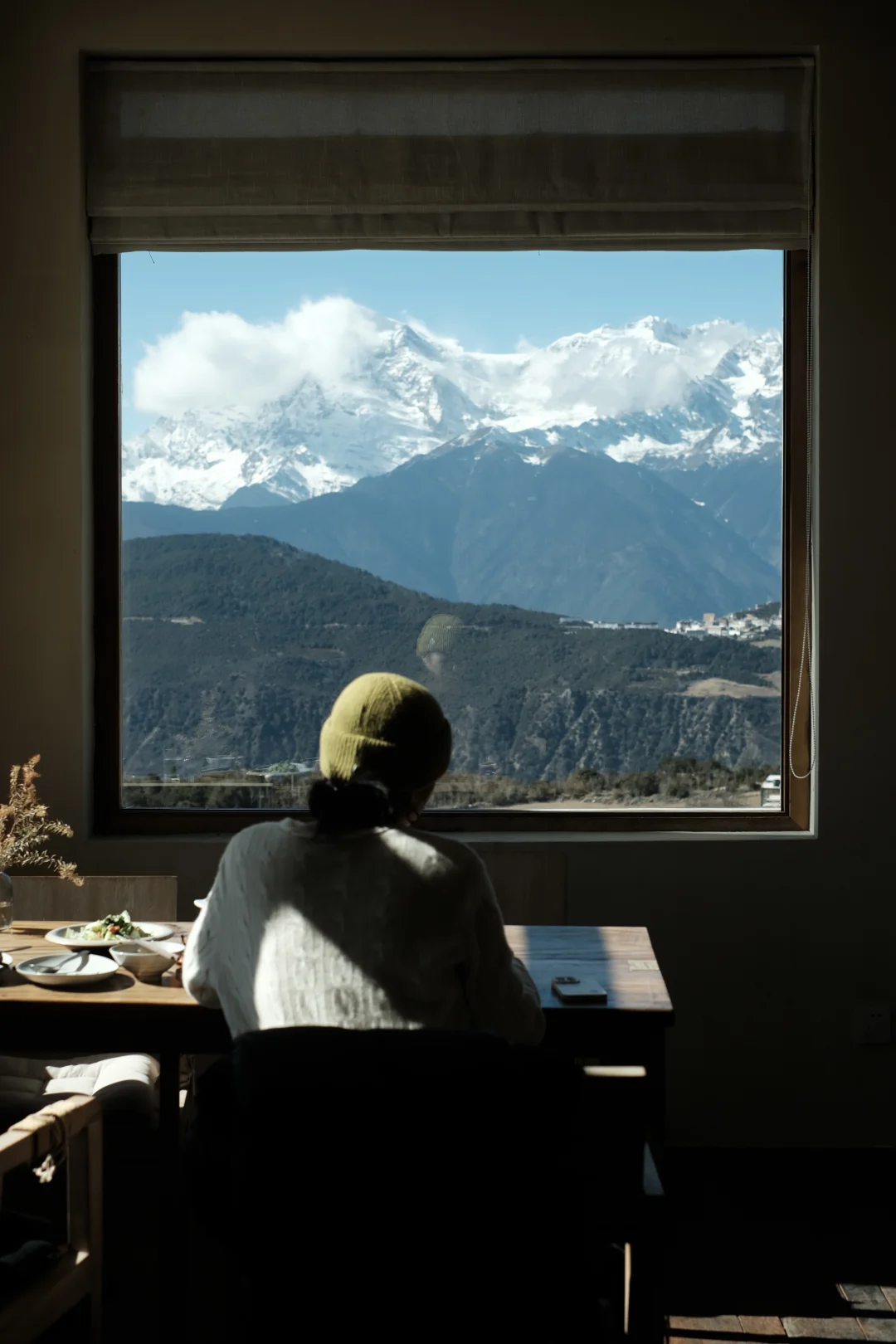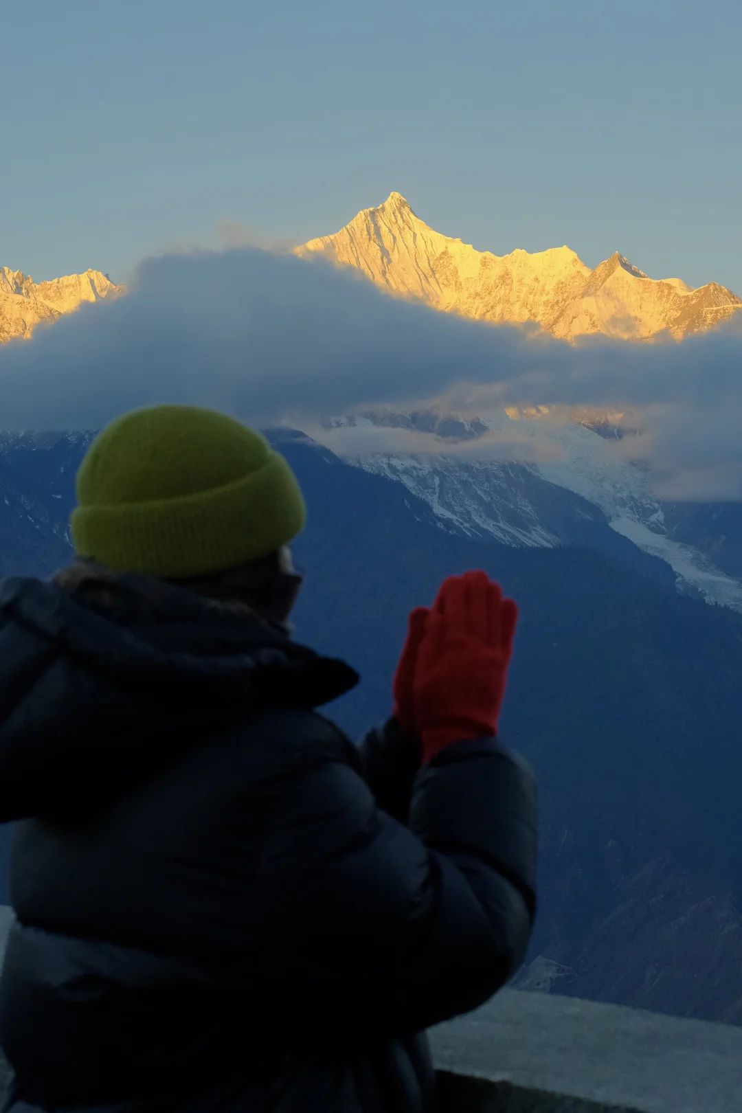 这次选的民宿有被小姐妹夸夸!住在了距离飞来寺观景台几十米的雪山醒来,房间、餐厅、咖啡都直面梅里雪山,太幸福了!对比了一下,民宿观景台比飞来寺观景台视野更好,近距离感受梅里雪山的震撼,长焦直接拍雪山证件照!看完日照金山我们又回去睡了回笼觉,一点苦没吃~房间有氧气有地暖,住了两晚竟还有点staycation的感觉!