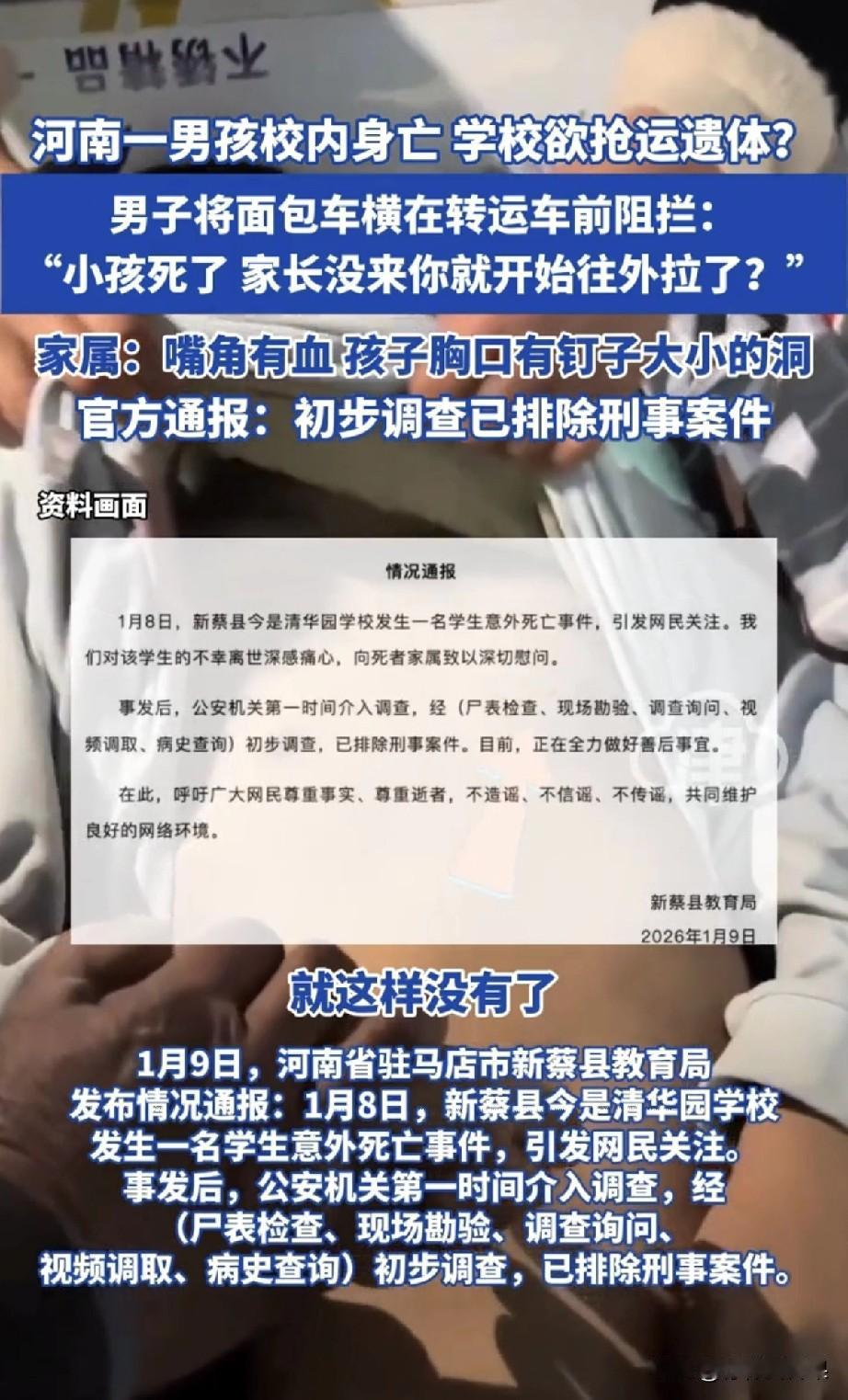 河南男孩校内没了,官方说排除刑案,可网友都不买账! 1月8号新蔡今是清华园学校,男孩校内离世,家属没到校方就想拉遗体,被姑父拦下。家属说孩子嘴角有血、胸口有洞,全身乌紫,校方啥都不解释。 9号官方通报排除刑案,却没回应任何疑点。大伙都质疑:真意外的话,校方为啥急着挪遗体?孩子的伤哪来的? 这事儿不能就这么算了,必须彻查细节,给家属一个实打实的交代!你们怎么看这个事件?河南男孩校内身亡