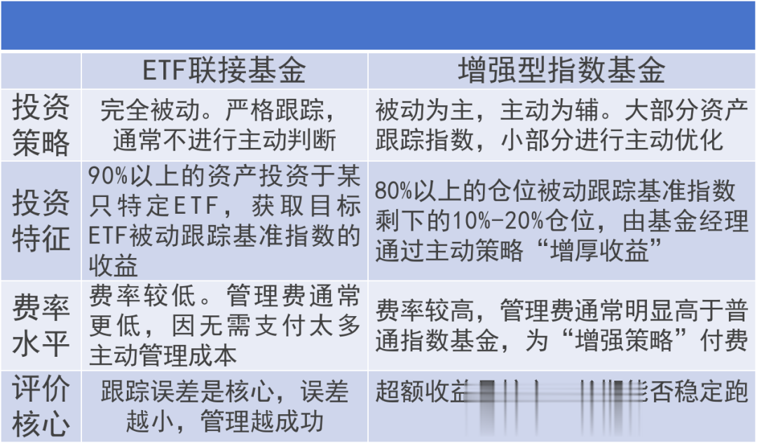 简单来说,如果您想要一面“镜子”,希望以最低成本、最透明的方式精准把握目标指数的整体表现,不奢求超额收益,也避免因主动判断失误带来的落后风险,那么ETF联接基金是你的理想工具;如果您想要一个“放大器”,相信基金经理有能力通过择时、选股等策略长期创造超额收益,并愿意为这种可能性支付更高的费用、承担可能跑输指数的风险,那么可以考察历史业绩稳定、策略清晰的增强型指数基金。