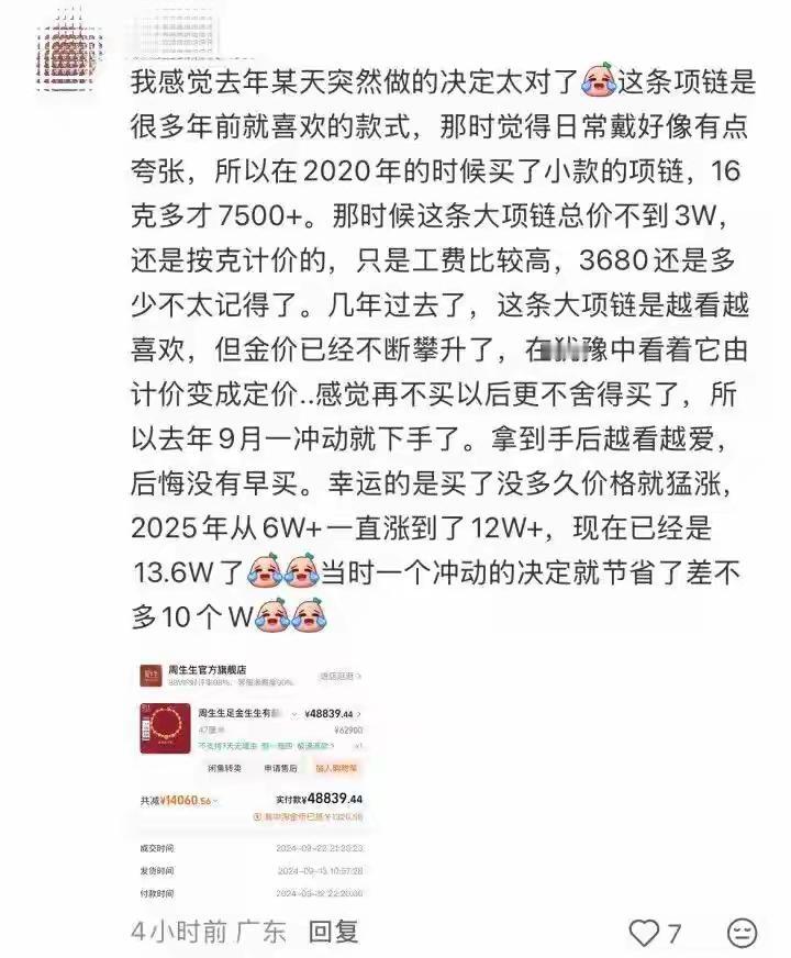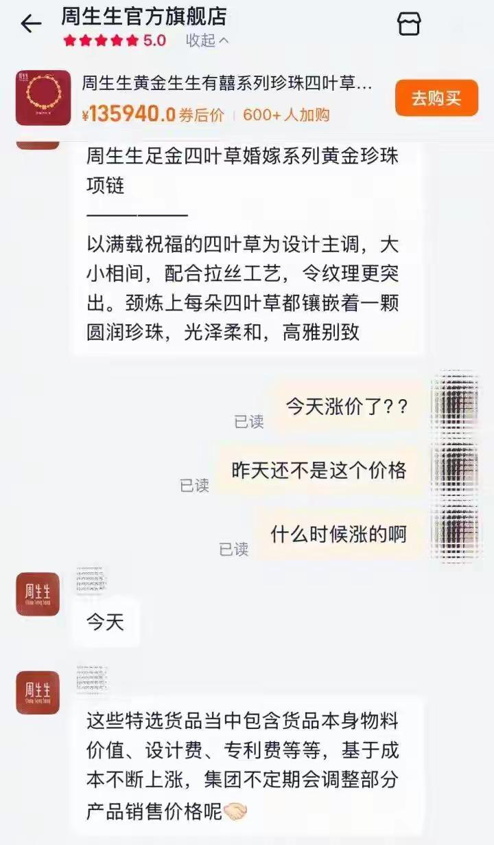 一条金项链,一夜涨了15200元!一年多涨了近10万 三天前刚涨过一轮的周生生,又悄悄提价了。 昨天,一位网友发现,周生生天猫旗舰店里一件生生有喜系列珍珠四叶草项链价格上调到了136000元,一夜之间暴涨15200元。 进入2026年不到10天时间,黄金品牌再次迎来涨价潮。除了周生生,潮宏基将于下周完成开年以来的首次调价,部分爆款饰品涨幅近20000元。 这到底是怎么回事?一夜之间,金饰价格像坐上了火箭,普通人还在为手中的存款焦虑不安,珠宝品牌却像打了鸡血似的不断调价。有人说,这是市场的正常波动;有人觉得,这是资本在背后操控的“涨价游戏”。但站在普通消费者的角度,我们不得不问:我们还能相信什么?我们的血汗钱还能用来买什么? 曾几何时,金饰代表着人们对美好生活的向往,是节日的礼物,是传家的财富。而如今,它变成了“涨价的金矿”。一件小小的项链,短短几天内涨了1万多元,普通家庭的梦想似乎变得遥不可及。我们心里难免泛起疑问:这真的是市场的自然规律,还是某些资本操控的“黑幕”? 更令人唏嘘的是,许多消费者在面对价格飙升时,心中满是无奈和愤怒。有人说:“我买不起了,原本打算给孩子买个毕业礼物,现在看来,只能望“金”兴叹。”有人则愤怒地质问:这是不是“价格绑架”?金价不断上涨,是否意味着我们在被剥夺了追求幸福的权利? 但也有人持不同观点。他们认为,这背后反映的是经济的复杂变化,是全球市场供需关系的调整。金价上涨,或许也是对未来不确定性的防御。毕竟,黄金历来被视为“避风港”。然而,问题的关键不在于涨价本身,而在于我们是否还能以合理的价格,买到自己心仪的饰品? 这场“金价风暴”究竟会持续多久?普通人该如何应对?是继续盲目跟风,还是理性看待?或许,我们更应该反思:在这个快节奏、浮躁的时代,金钱的价值究竟意味着什么?我们追逐的到底是金子,还是那份对美好生活的向往? 或许,下一次当你看到金饰价格再一次飙升时,不妨停下来想想:我们真正需要的,是一份稳定的幸福,还是一份被操控的“金”梦?在这个金价不断上涨的背后,隐藏着多少我们未曾察觉的故事?让我们一起深思,别让“金”迷了双眼。周生生的金价 周生生的黄金
