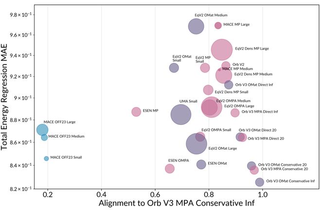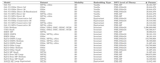 多元架构的对比(部分):论文评估了包括Orb、MACE、DeepSeek在内的近60种模型,为科学家的选择提供了定量依据。