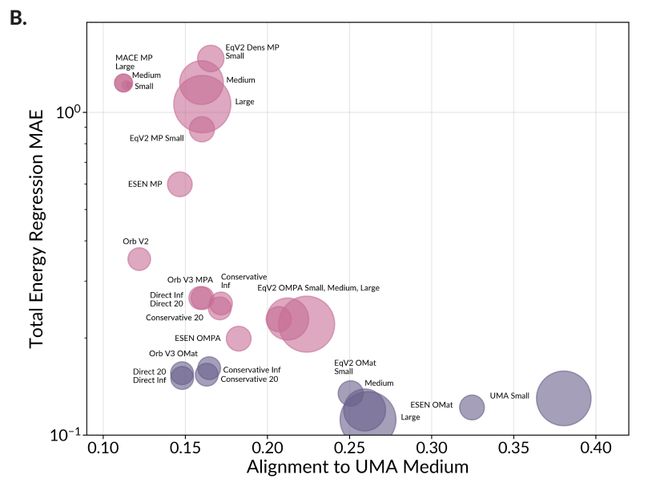 图中圆点的大小代表模型参数量。可以看到,即使是较小的模型,只要其表征能与最佳性能模型对齐,同样能在分子能量预测任务中获得极高的准确度。