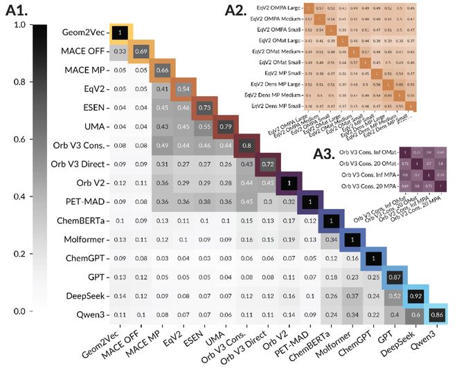 跨架构的表征对齐:矩阵中的深色区域显示了OrbV3等高性能模型与其它严谨物理模型(如MACE、EqV2)之间强烈的共鸣。