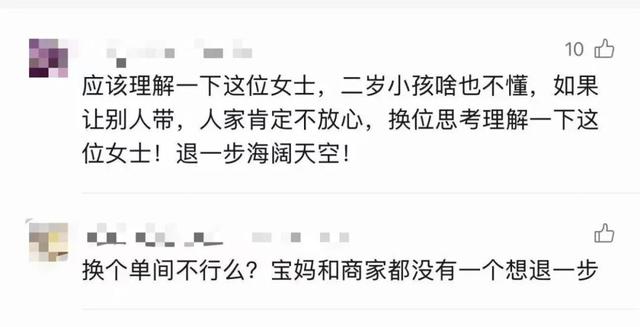 也有网友表示理解,“二岁小孩啥也不懂,肯定不放心交给陌生人带,换位思考理解一下吧”“我个人能接受三岁以下男童带进浴室(游泳馆换衣间和厕所),我也尊重有些女孩不能接受异性在这些地方。”
