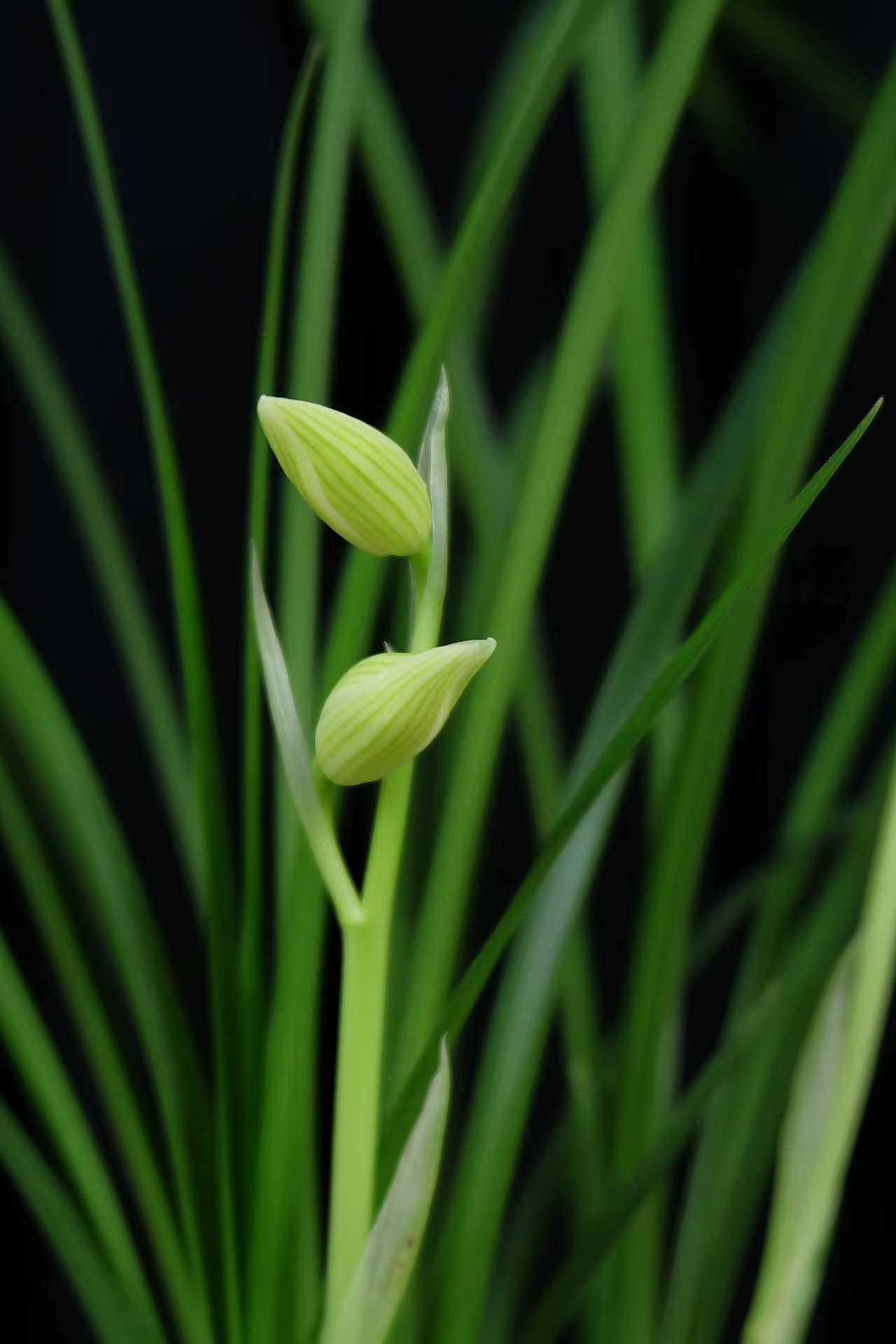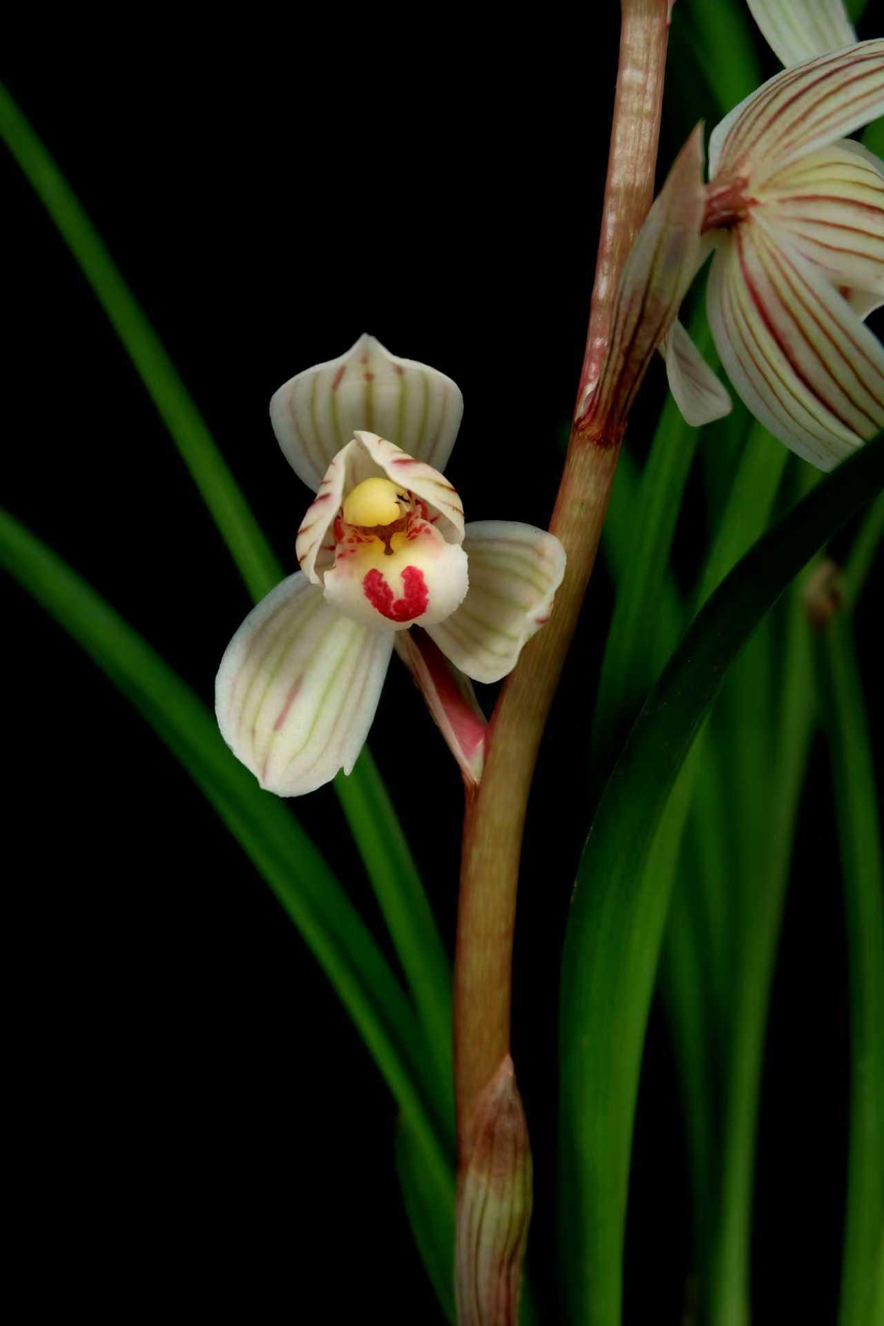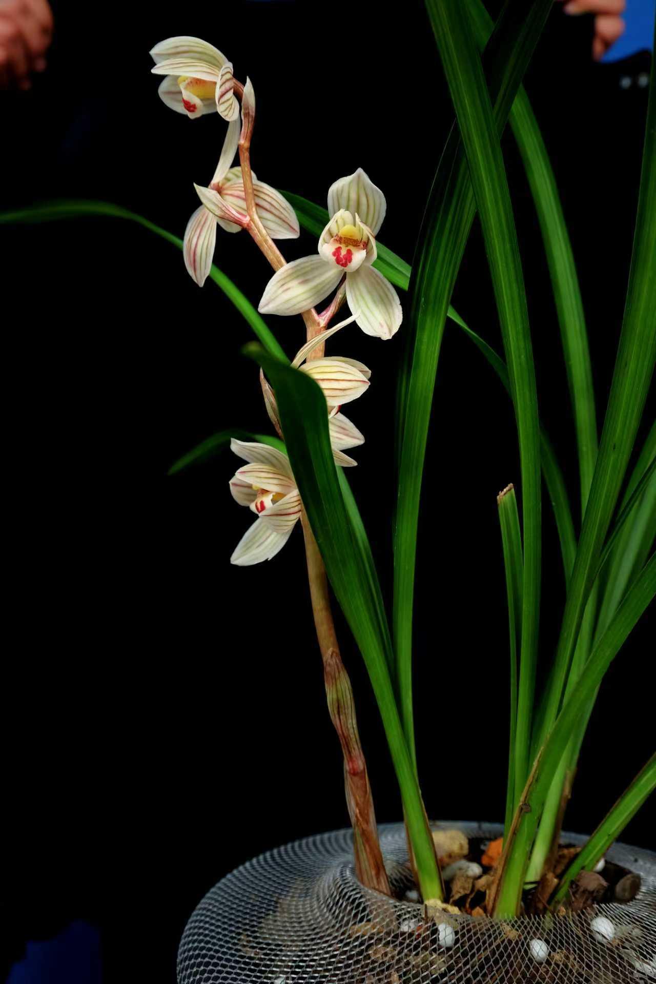 各展风姿的几株兰花:有的是淡绿带纹的花苞,似将绽未绽;有的花瓣白绿间红纹点缀,花心黄红相映;还有的淡黄绿带绿纹,盛开与花苞同立,在绿叶衬映下,都透着清新雅致。