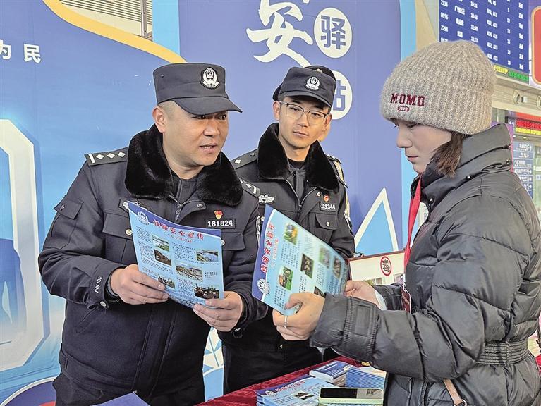 “这个小卡片你收好,上火车后陌生人给的饮料可不能喝哦!”平安驿站的宣传台前,民警给准备前往甘肃省兰州市旅游的大学生王小月递上一本彩色的禁毒宣传册。展台前,反诈、禁毒、治安等各类宣传资料摆得满满当当,民警们拿着新型毒品仿真模型,用接地气的语言给旅客讲解:“你看这个‘跳跳糖’,看着像零食,其实是毒品伪装的,一定要擦亮眼睛!”旅客们认真聆听,有的掏出手机拍下宣传要点,有的围在一起讨论防范妙招。