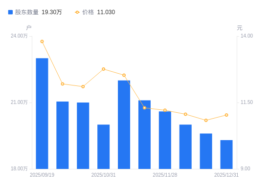 日期A股户数(户)流通A股户均持股数(股)户均持股市值(万元)2025-12-311930007059.407.792025-12-201960006951.357.532025-12-102000006812.327.532025-11-282060006613.907.412025-11-202110006457.187.302025-11-102200006193.027.762025-10-312000006812.328.692025-10-202100006361.187.702025-09-302104616347.257.742025-09-192300005802.848.01