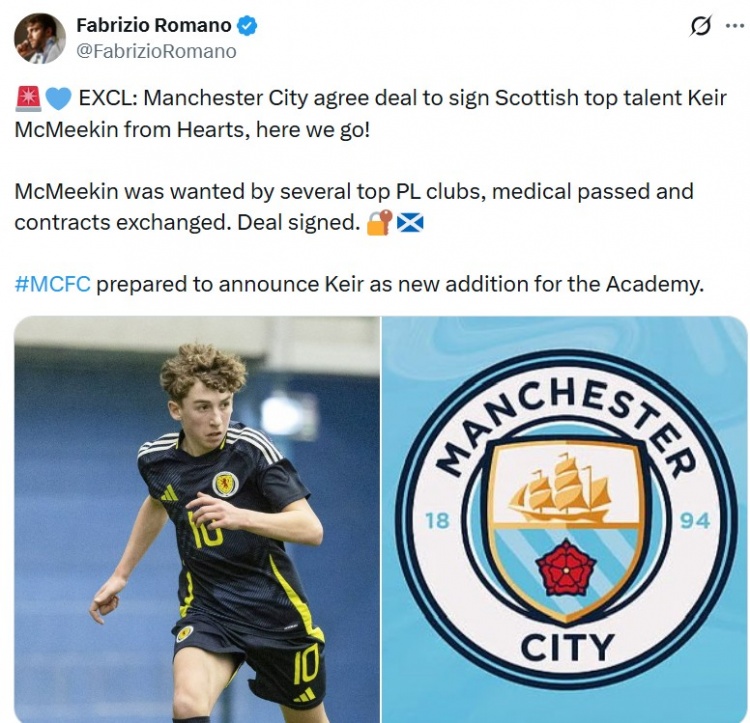 直播吧1月9日讯据知名转会记者罗马诺报道,曼城即将从哈茨签下苏格兰天才球员基尔·麦克米金,Herewego。