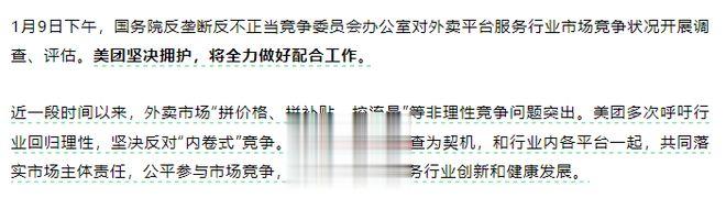 据“美团Meituan”消息,1月9日下午,国务院反垄断反不正当竞争委员会办公室对外卖平台服务行业市场竞争状况开展调查、评估。