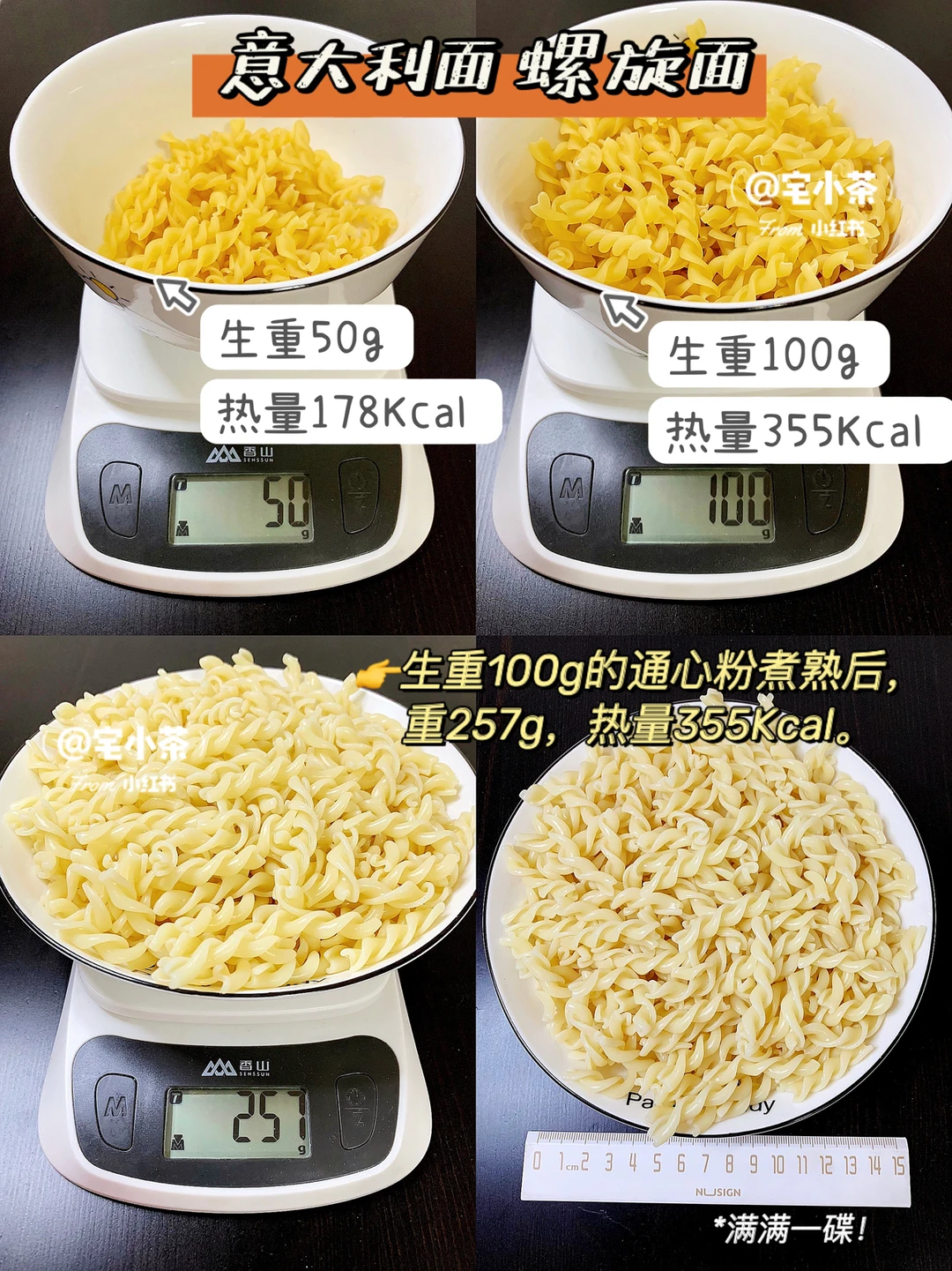 👉生重100g的通心粉煮熟后,重257g,热量355Kcal。